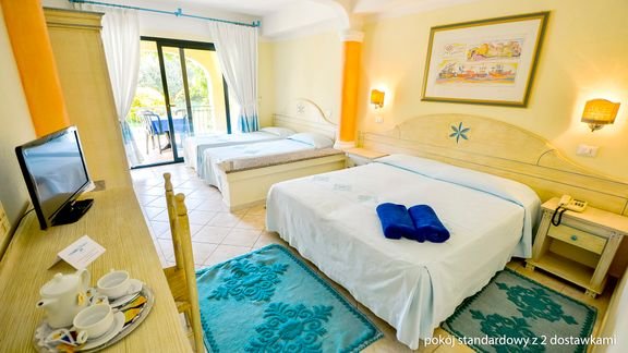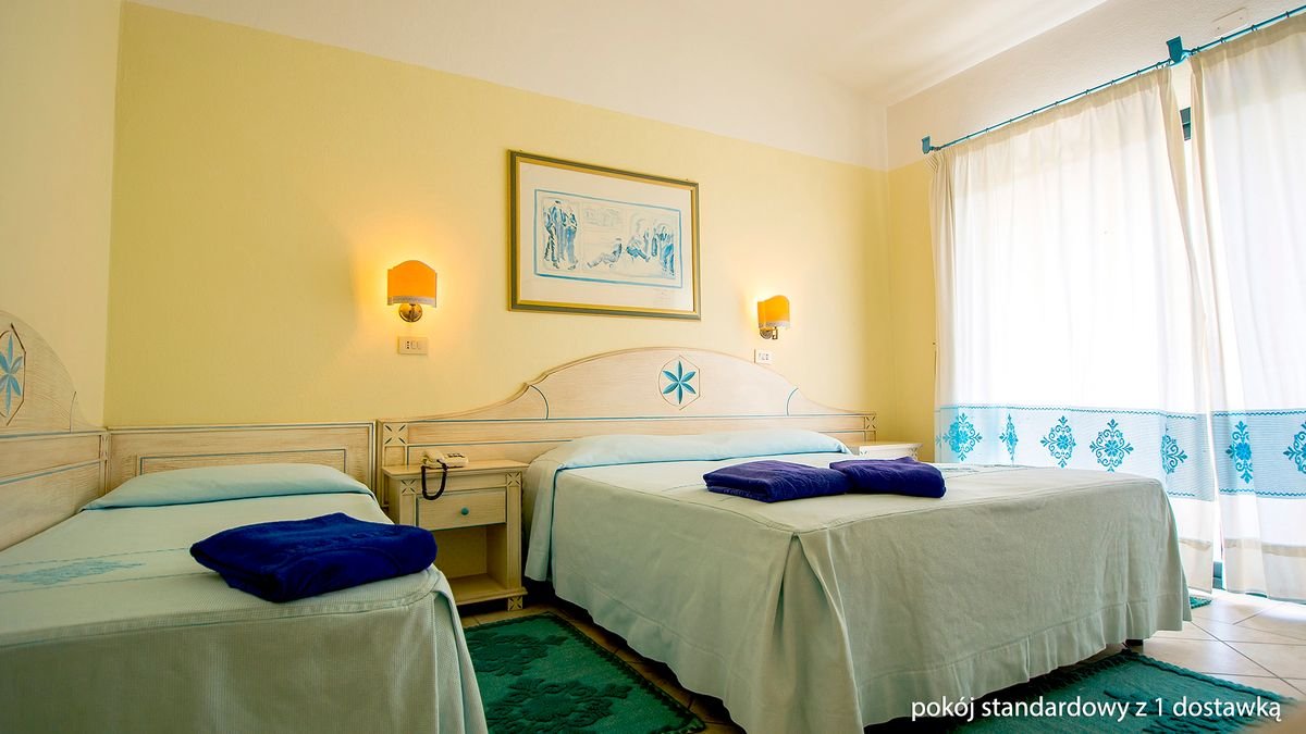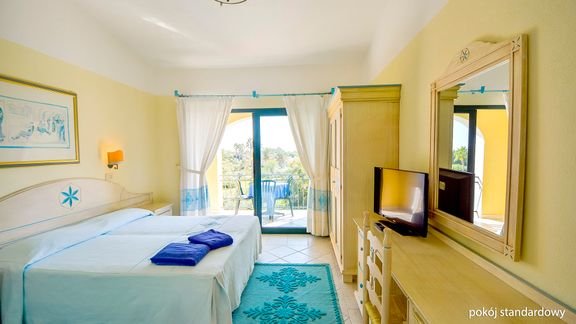 standardowy: 2-os. (możliwość 1 lub 2 dostawek), ok. 18-25 m², utrzymany w prostym, sardyńskim stylu, indywidualnie sterowana klimatyzacja, łazienka (prysznic lub wanna, wc; suszarka), telewizja, sejf (za opłatą), minibar (płatny wg konsumpcji); łóżeczko dla dziecka do 2 lat na zamówienie przed przyjazdem (płatne w recepcji: ok. 15 EUR/noc); balkon lub taras (stolik i krzesełka).