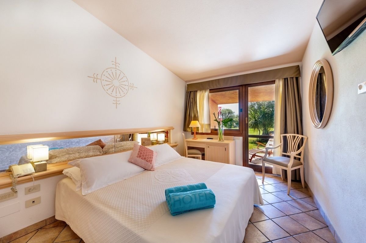 standardowy: 2-os. (możliwość 1 dostawki dla dziecka), ok. 20 m², urządzony w sardyńskim stylu, klimatyzowany, łazienka (prysznic, wc; suszarka), internet bezprzewodowy, telewizor, telefon, sejf, minibar (płatny wg konsumpcji); patio (stolik i krzesełka); rodzinny: 2-os. (możliwość 2 dostawek dla dzieci), ok. 25 m2, urządzony w sardyńskim stylu, wyposażenie jak w pokoju standardowym, dodatkowo: antresola; patio (stolik i krzesełka); pokój rodzinny za dopłatą.