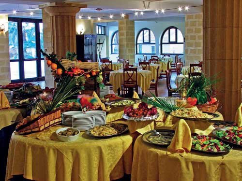 śniadanie (7.30-9.30), obiad (13.00-14.15), kolacja (20.00-21.30) w restauracji (bufet lub serwowane), woda i wino do posiłków.