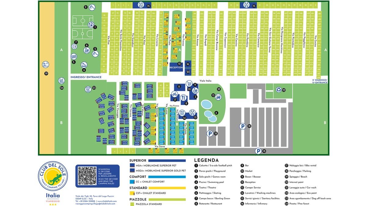 ok. 4,5 km od centrum VIAREGGIO ze sklepami, restauracjami, barami i mariną, przy Parku Krajobrazowym Migliarino San Rossore, ok. 4 km od jeziora Massaciuccoli, ok. 20 km od Pizy; ok. 26 km od lotniska w Pizie.