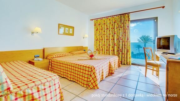 standardowy: 2-os. (możliwość 1 dostawki), ok. 22 m², zadbany, indywidualnie sterowana klimatyzacja, łazienka (wanna lub prysznic, wc; suszarka), telewizor, sejf (płatny: ok. 25 EUR/tydz., kaucja: ok. 20 EUR); bezpłatne łóżeczko dla dziecka do 2 lat; balkon lub taras (stolik i krzesełka); widok na morze za dopłatą; rodzinny: 2-os. (możliwość 1 lub 2 dostawek), ok. 42 m², pokój dzienny i sypialnia oddzielone drzwiami; wyposażenie jak w pokoju standardowym; pokój rodzinny na zamówienie, za dopłatą.