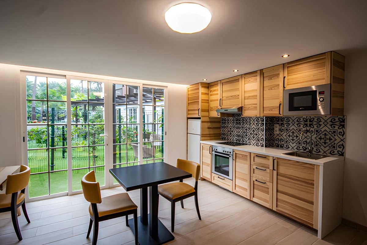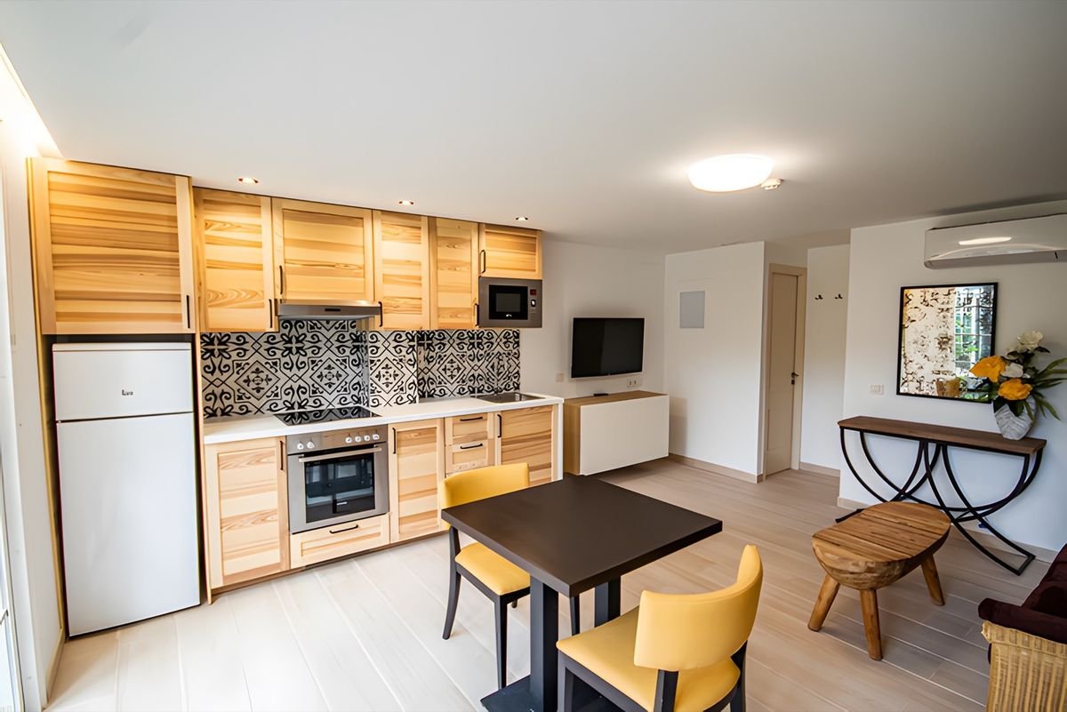 apartament: 2-os. (możliwość 1 dostawki), ok. 35 m², indywidualnie sterowana klimatyzacja (płatna: ok. 10 EUR/dzień), łazienka (prysznic, wc; suszarka), sypialnia i salon z wyposażonym aneksem kuchennym wydzielone optycznie, internet bezprzewodowy, telewizja satelitarna, zestaw do kawy/herbaty; za opłatą: sejf; balkon lub taras (stolik i krzesełka), widok na okolicę.