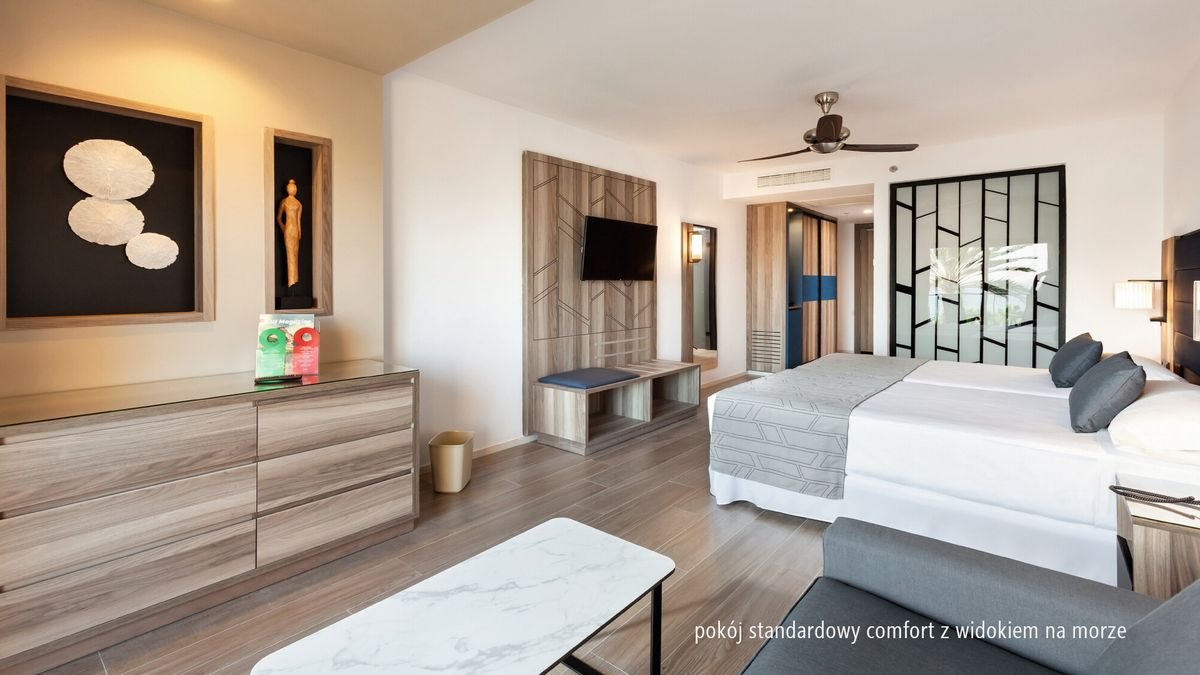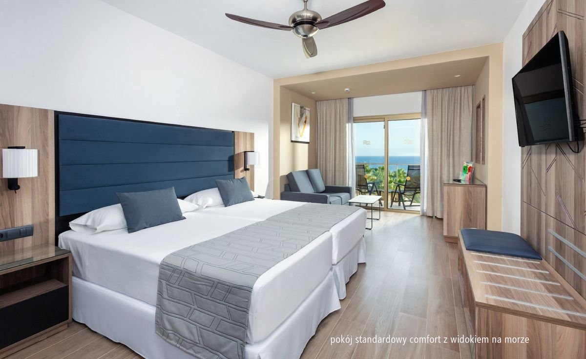 standardowy: 2-os., ok. 34 m², elegancki i nowoczesny, klimatyzowany, łazienka (prysznic, wc; suszarka), internet bezprzewodowy, telewizja satelitarna, lodówka, telefon; za opłatą: sejf, minibar (płatny wg zużycia); bezpłatne łóżeczko dla dziecka do 2 lat na zamówienie przed przyjazdem; balkon lub taras (stolik i krzesełka); standardowy comfort: 4-os. (możliwość dostawki dla os. dorosłej lub 2 dzieci – sofa), ok. 32 m² , klimatyzowany, elegancki i nowoczesny, łazienka (prysznic, wc; suszarka), telewizja satelitarna, telefon, internet bezprzewodowy, lodówka; za opłatą: sejf, minibar (płatny wg zużycia); bezpłatne łóżeczko dla dziecka do 2 lat na zamówienie przed przyjazdem; balkon lub taras (stolik i krzesełka), widok na ogród; pokój standardowy comfort z widokiem na morze: 4-os. (możliwość dostawki dla os. dorosłej lub 2 dzieci – sofa), ok. 34 m² , klimatyzowany, wyposażenie jak w pokoju standardowym comfort; balkon lub taras; boczny widok na morze.