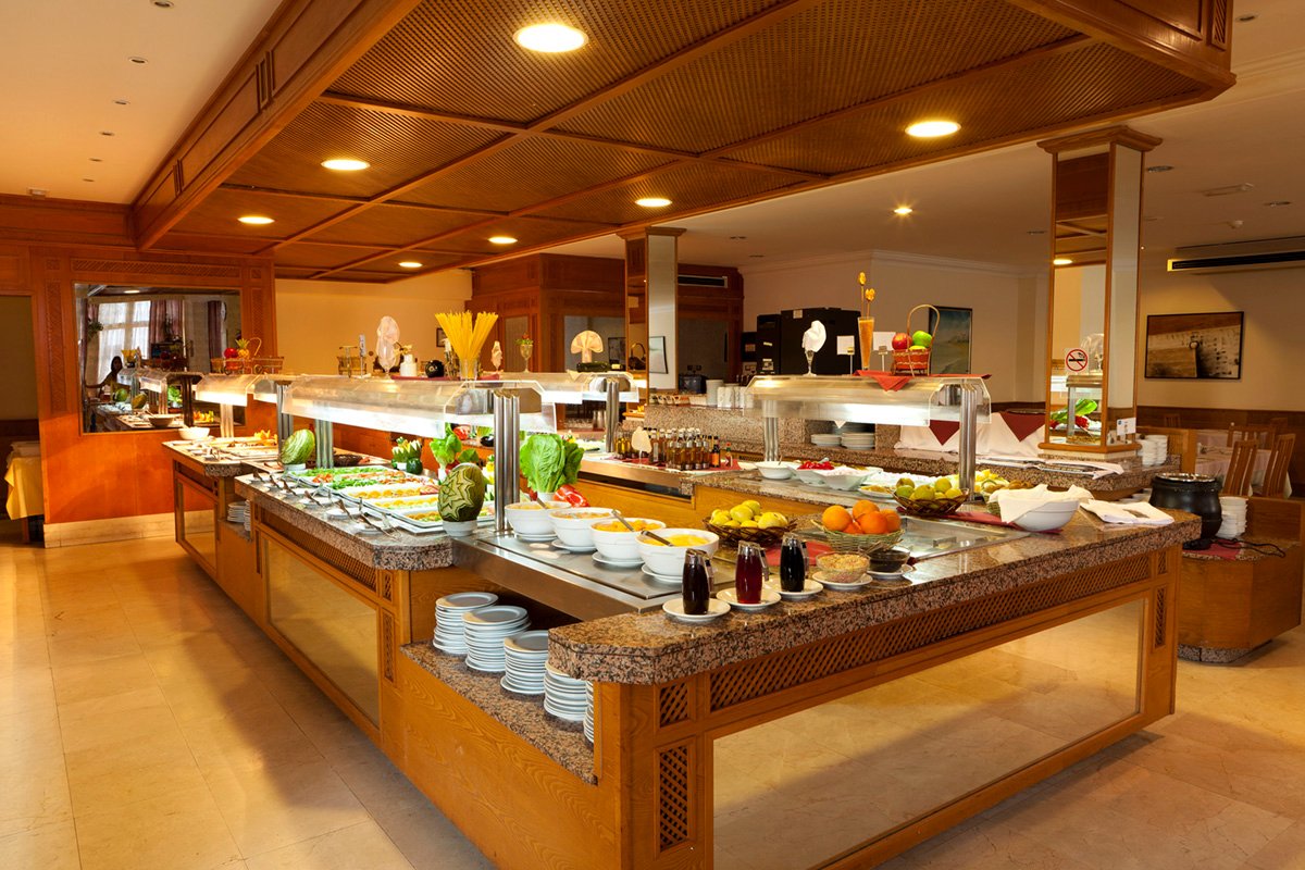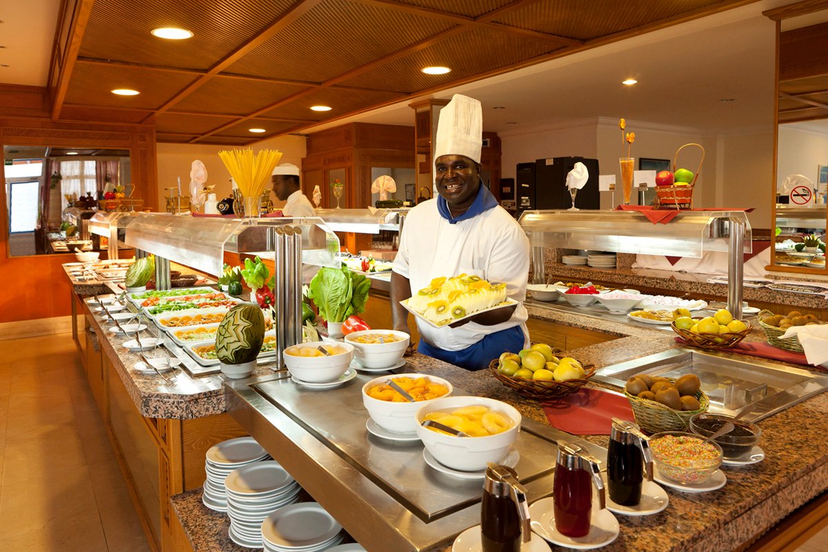 śniadanie (8.30-10.30), obiad (13.00-15.00), kolacja (19.00-21.00) w formie bufetu w restauracji głównej; przekąski w snack barze (10.00-18.00); napoje bezalkoholowe i lokalne napoje alkoholowe w barze przy basenie (10.00-23.00); wymagane noszenie opasek all inclusive.