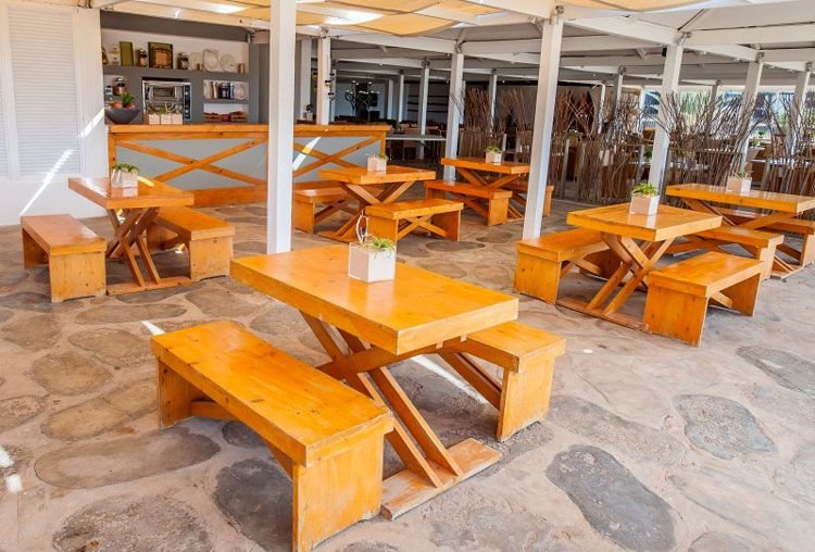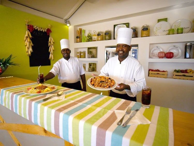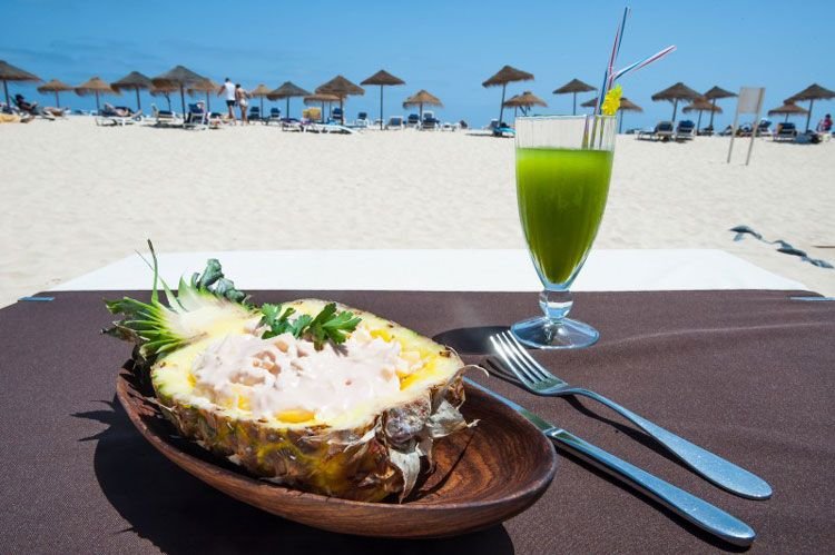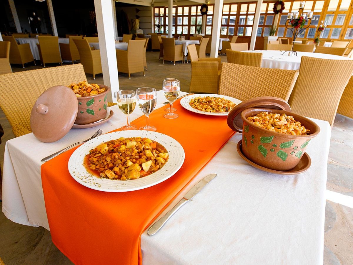 śniadanie (7.00--10.00), obiad (12.30-15.00), kolacja (18.00-21.30) w restauracji głównej; przekąski (11.00-12.00); kawa, herbata (16.00-18.00); napoje bezalkoholowe i lokalne napoje alkoholowe w wyznaczonym barze (10.00--24.00); trzy razy na pobyt kolacja w restauracji à la carte (2 x Salinas, 1 x Flor de Sal); wymagane noszenie opasek all inclusive.