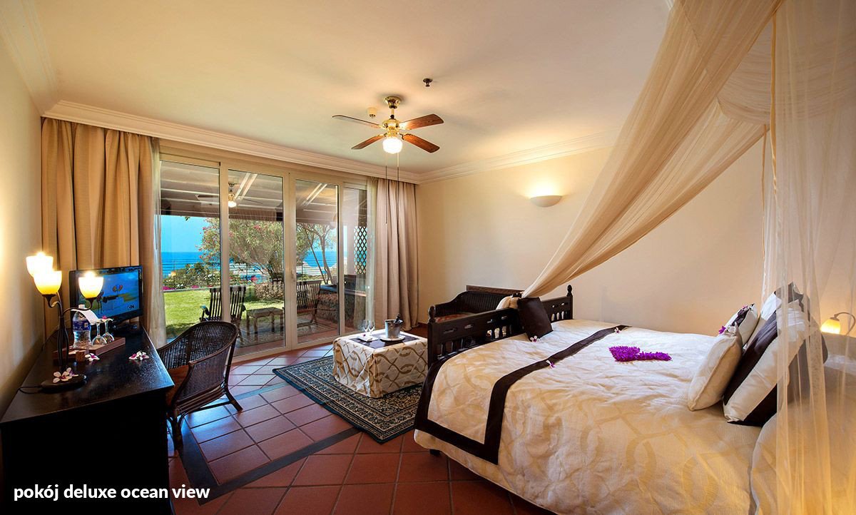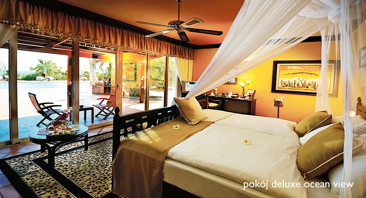 villa club: 2-os. ok. 32 m², nowoczesny i luksusowy, sypialnia, pokój dzienny dzielony z innymi pokojami, indywidualnie sterowana klimatyzacja, wentylator sufitowy, łazienka (prysznic, wc; suszarka), moskitiera, telewizja satelitarna, telefon, zestaw do kawy/herbaty, sejf, minibar; bezpłatne łóżeczko dla dziecka do dwóch lat na zamówienie przed przyjazdem; balkon, taras lub ogródek (stolik i krzesełka); deluxe ocean view: 2-os. (możliwość 1 dostawki), ok. 35 m², elegancki; balkon, taras lub ogródek (stolik i krzesełka), skierowane w stronę oceanu, wyposażenie jak w pokoju villa club; suite: 2-os. (możliwość 1 lub 2 dostawek), ok. 70 m², luksusowy, pokój dzienny z aneksem kuchennym i sypialnia przedzielone drzwiami; wyposażenie jak w pokoju standardowym, dodatkowo moskitiera; pokój deluxe ocean view i suite na zapytanie, za dopłatą.