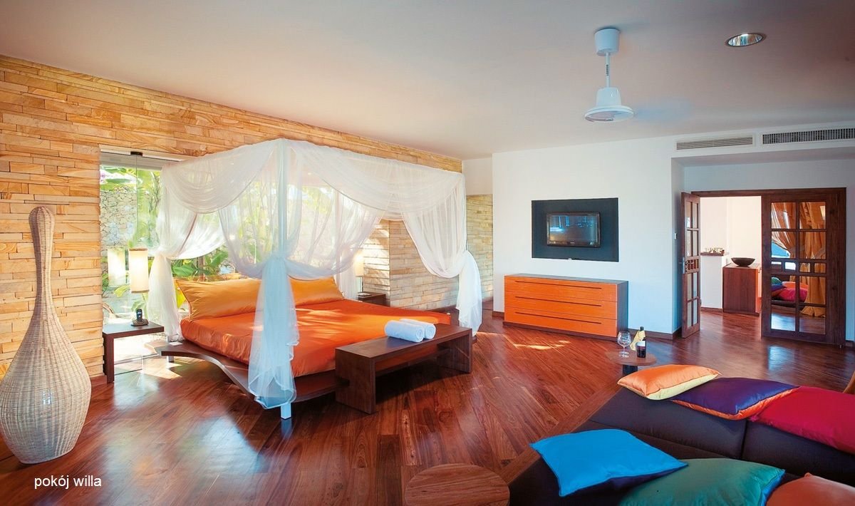 willa: 2-os., ok. 100 m², nowoczesna i luksusowa, indywidualnie sterowana klimatyzacja, wentylator, łazienka (prysznic, wc i bidet, suszarka, szlafroki), telewizja satelitarna (LCD), kącik biznesowy (notebook), telefon, sejf, moskitiera, zestaw do kawy/herbaty; za opłatą: internet bezprzewodowy, minibar; bezpłatne łóżeczko dla dziecka do 2 lat na zamówienie przed przyjazdem; taras i ogródek (stolik i krzesełka, leżaki), prywatny basen i jacuzzi na tarasie, prysznic; widok na ocean; willa dwupokojowa: 2-os., ok. 150 m², dodatkowa sypialnia; wyposażenie jak w willi jednopokojowej; willa z dodatkowym jacuzzi w pokoju na zapytanie; każda willa ma prywatnego kamerdynera, do którego zadań należy pomoc przy zakwaterowaniu i obsługa willi.