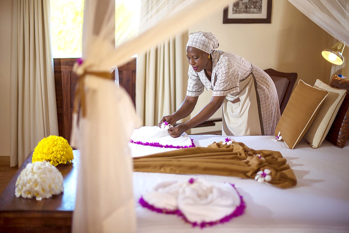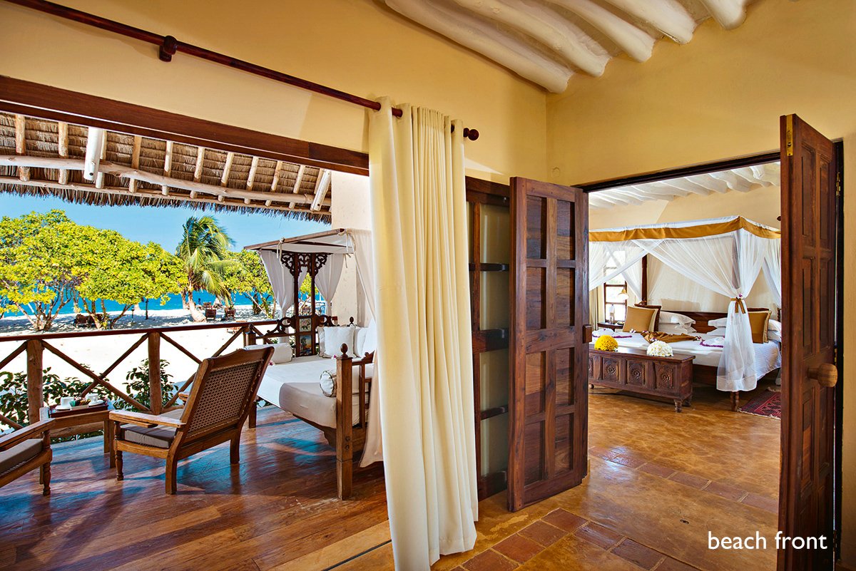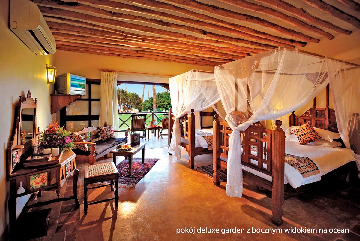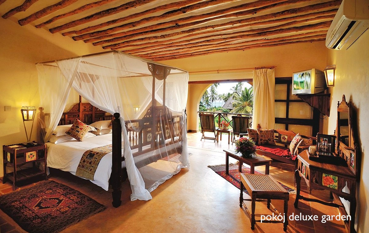 deluxe garden: 2-os. (możliwość 1 dostawki), ok. 40 m², luksusowy, elegancki, w stylu suahili, indywidualnie sterowana klimatyzacja, wentylator, łazienka (wanna lub prysznic, wc; suszarka), moskitiera, telewizja satelitarna, telefon, lodówka/minibar, zestaw do kawy/herbaty, sejf; balkon lub taras (stolik i krzesełka), widok na ogród; boczny widok na ocean za dopłatą; master suite beach front: 2-os. (możliwość 1 dostawki), ok. 100 m², pokój dzienny i sypialnia, wyposażenie jak w deluxe, dodatkowo: szlafroki, jacuzzi w łazience, telewizor LCD, room-service, widok na ocean; pokój suite beach front na zamówienie, za dopłatą.