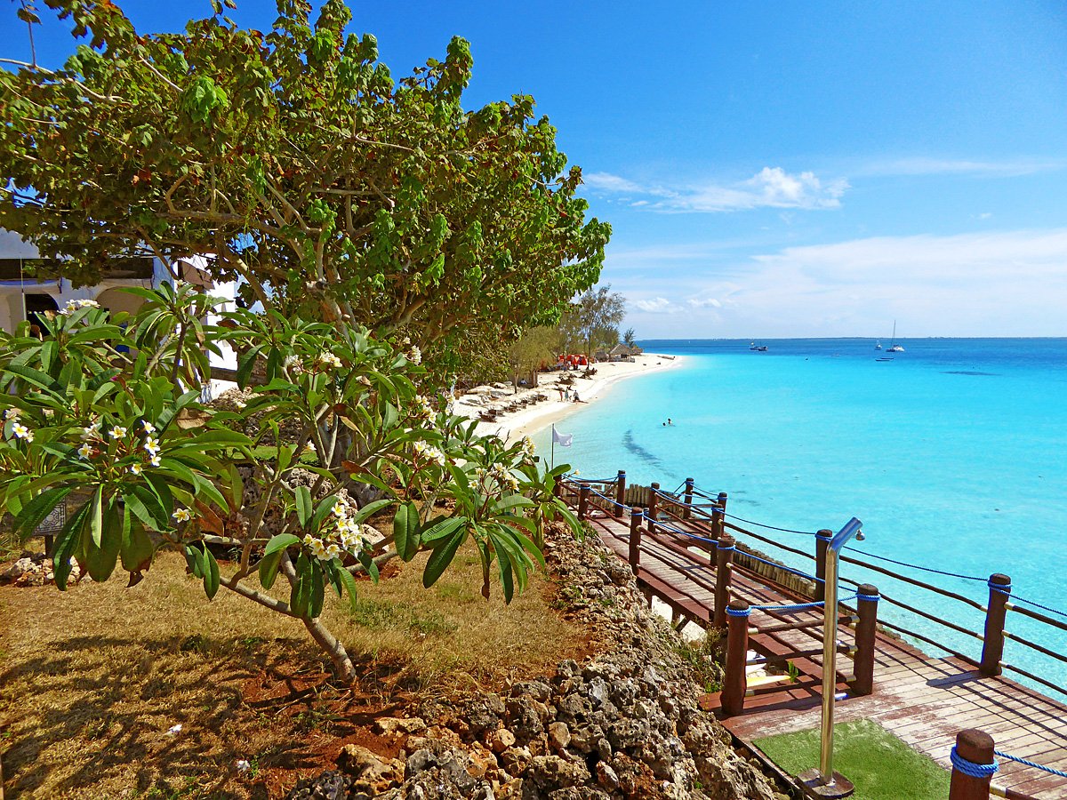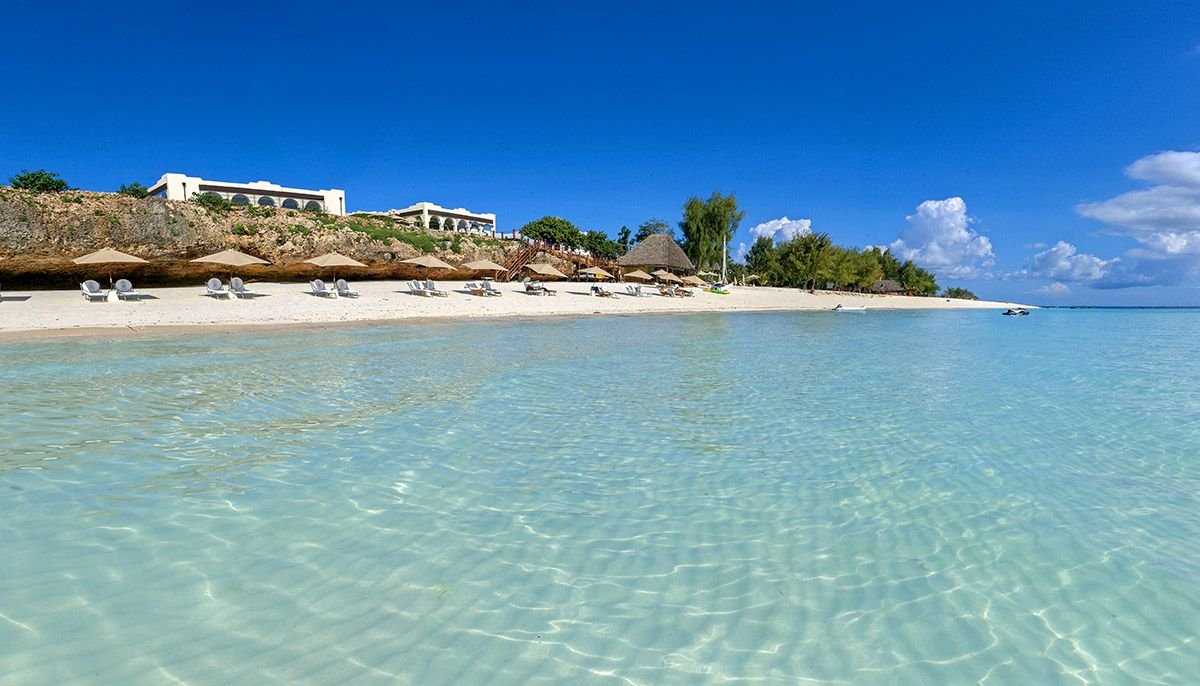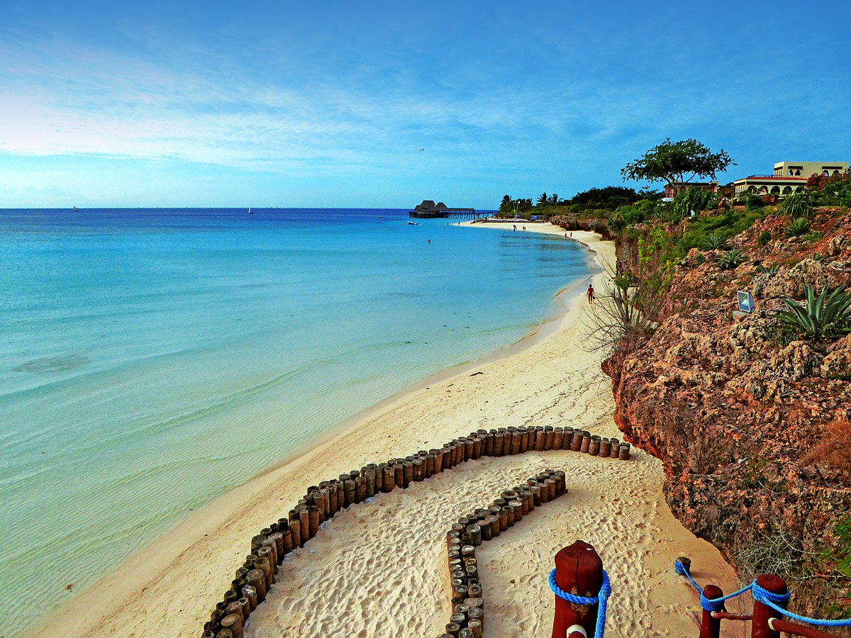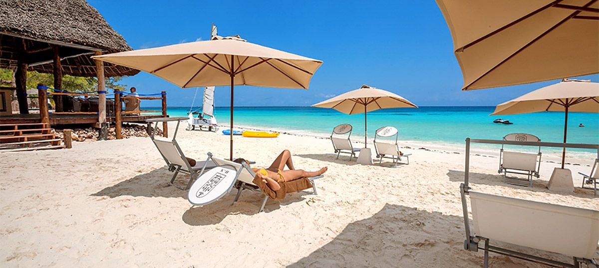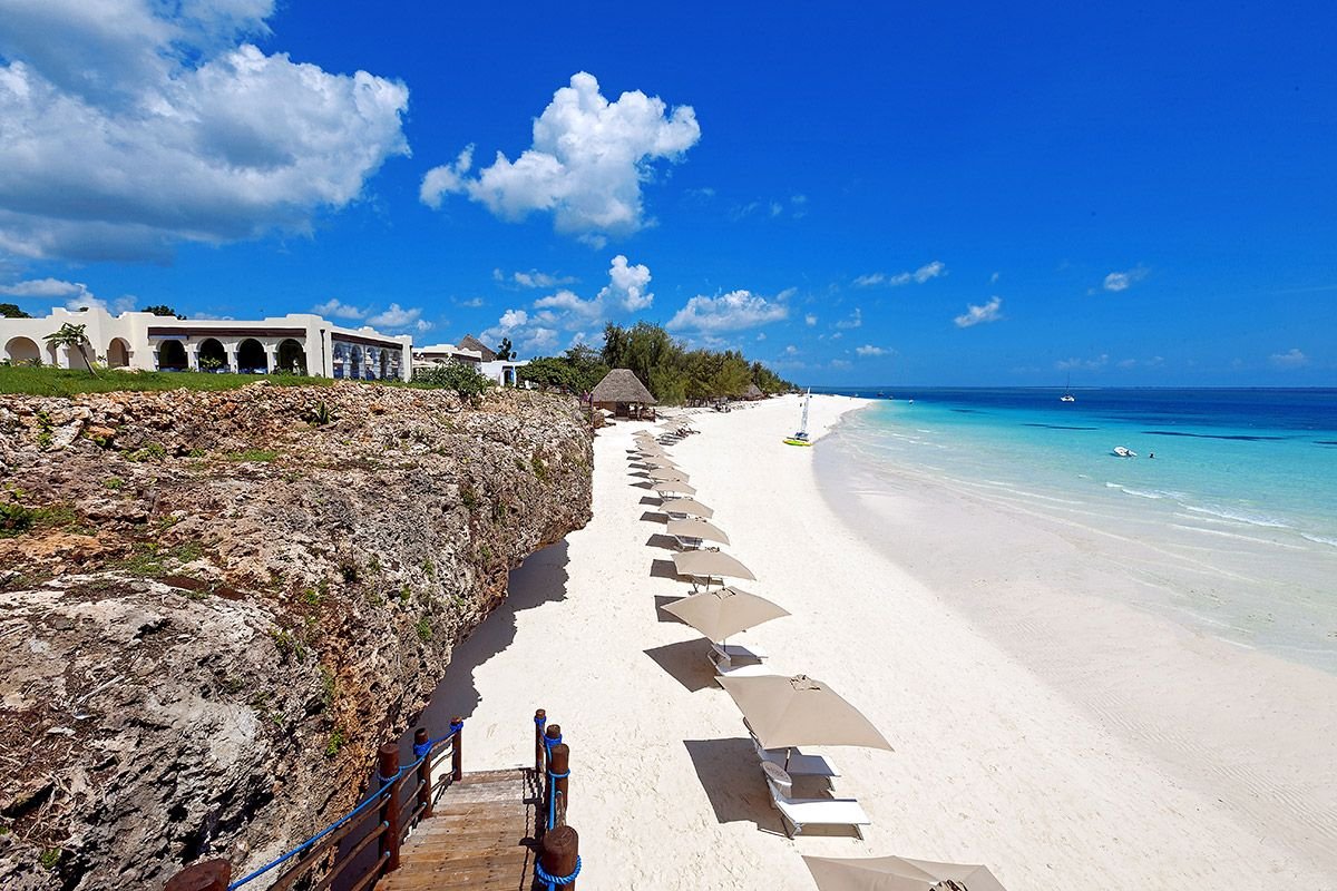 Nungwi, hotelowa, biały, miękki pudrowy piasek, łagodne zejście do morza, bezpośrednio przy hotelu – zejście po schodach z terenu hotelowego, przy basenie sztucznie usypana plaża, na plażach bezpłatne parasole, leżaki i ręczniki.