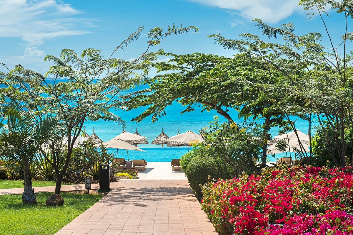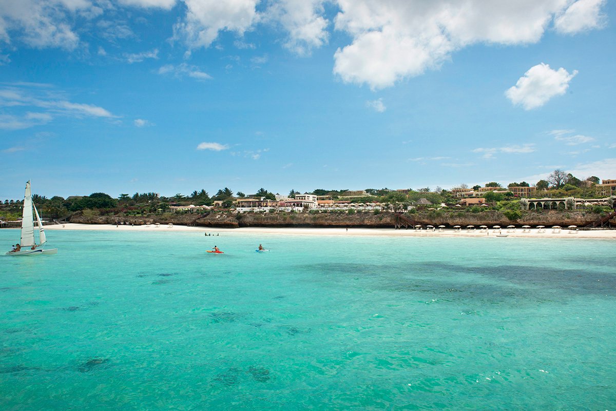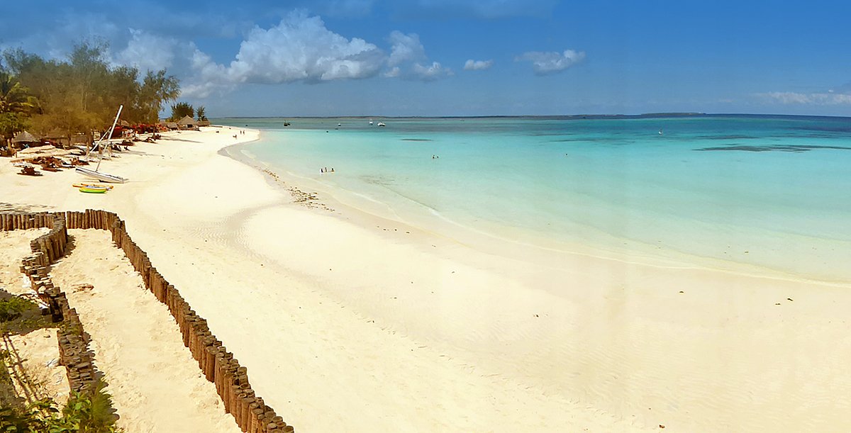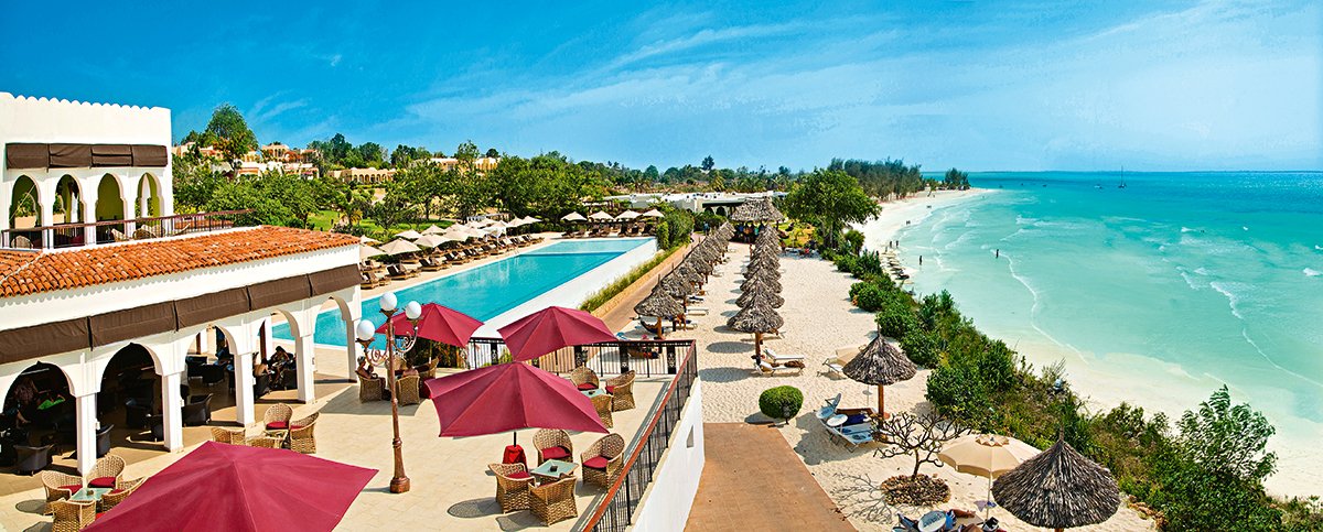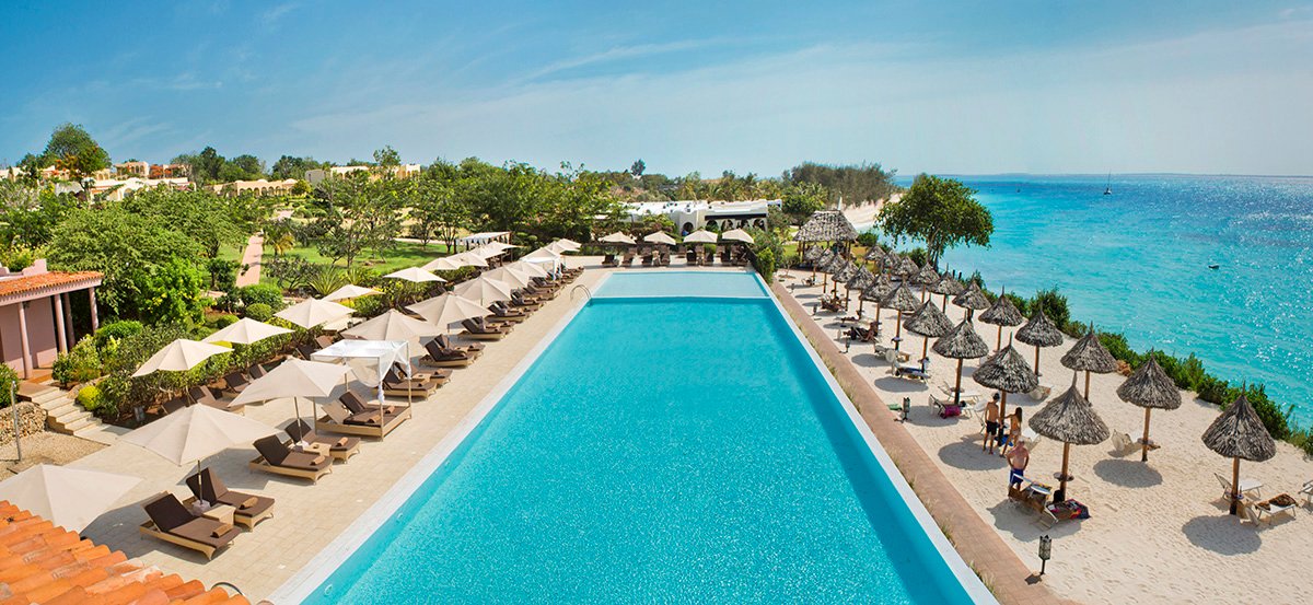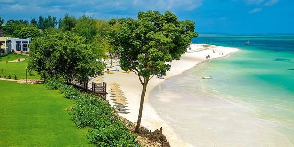 Nungwi, hotelowa, biały, miękki pudrowy piasek, łagodne zejście do morza, bezpośrednio przy hotelu – zejście po schodach z terenu hotelowego, przy basenie sztucznie usypana plaża, na plażach bezpłatne parasole, leżaki i ręczniki.