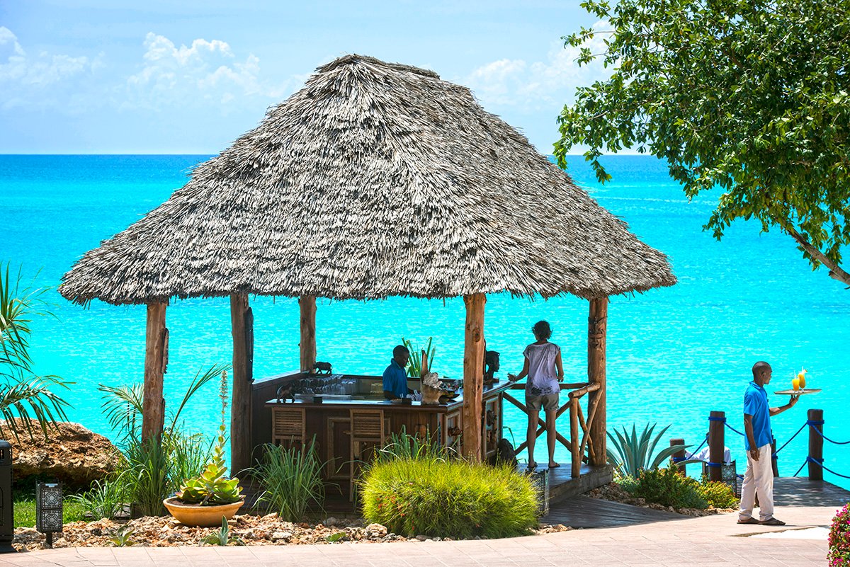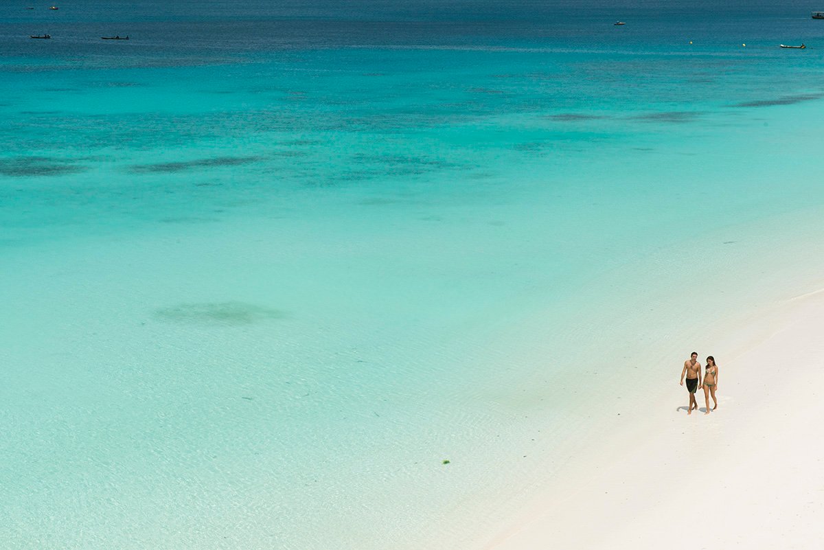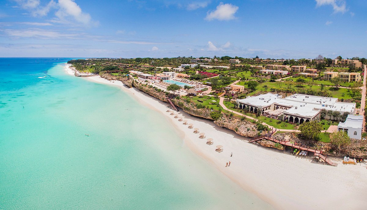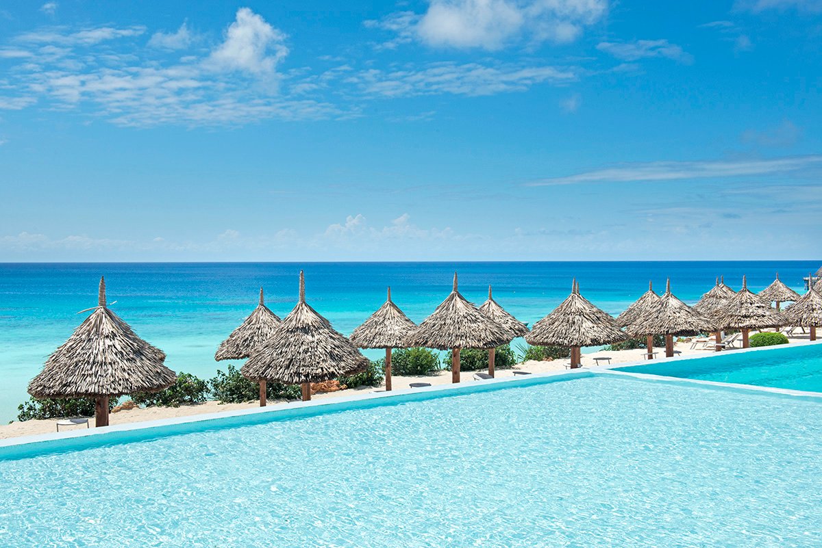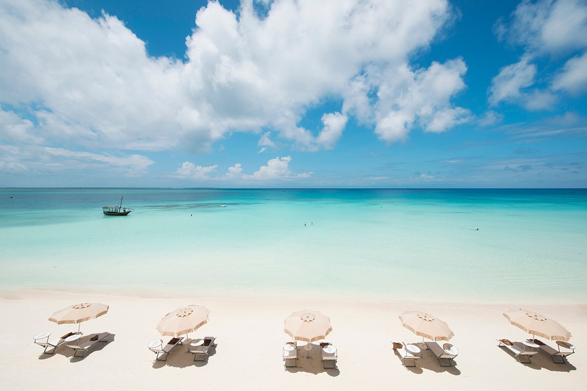 Nungwi, hotelowa, biały, miękki pudrowy piasek, łagodne zejście do morza, bezpośrednio przy hotelu – zejście po schodach z terenu hotelowego, przy basenie sztucznie usypana plaża, na plażach bezpłatne parasole, leżaki i ręczniki.