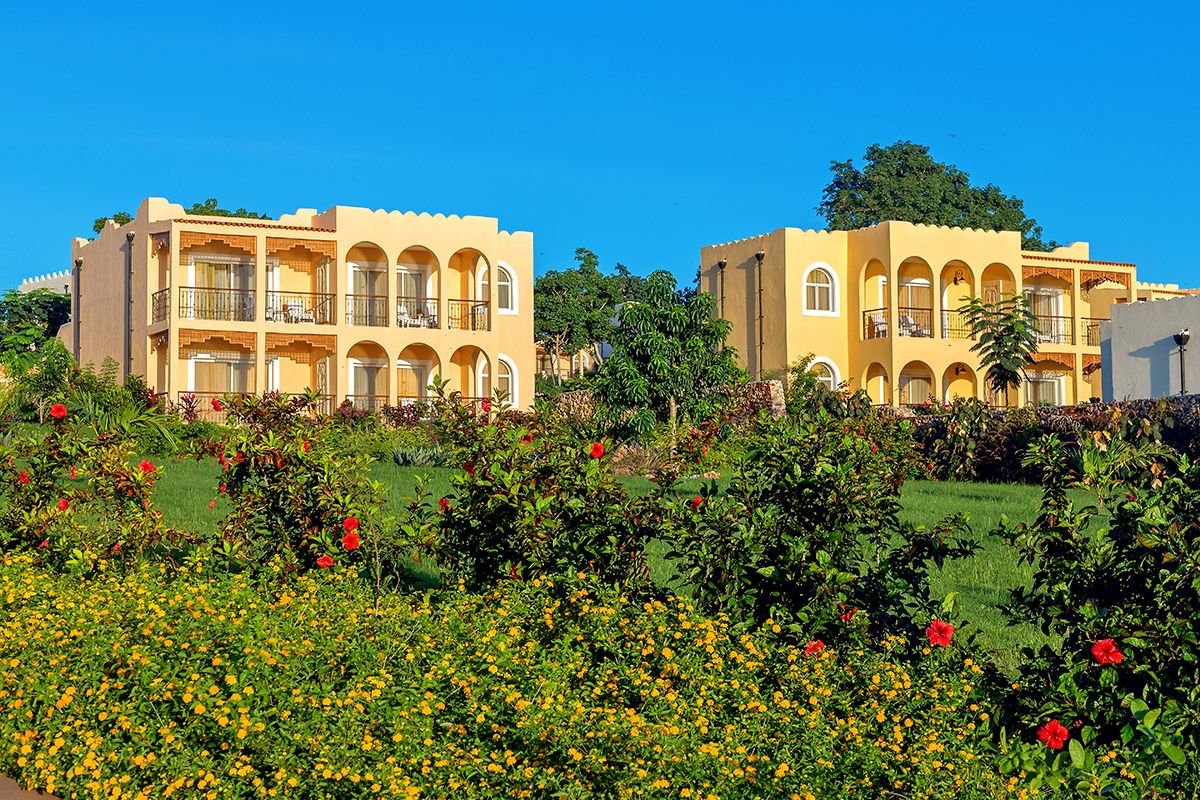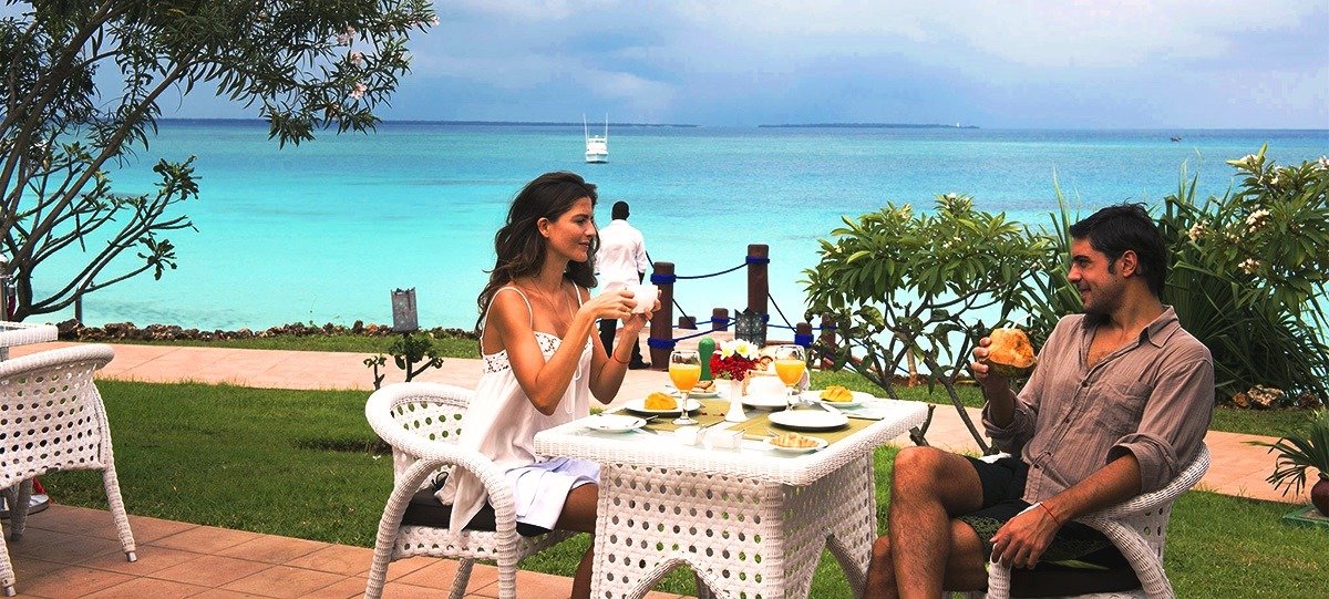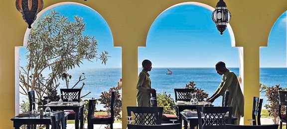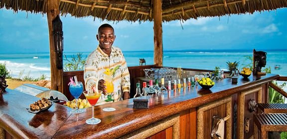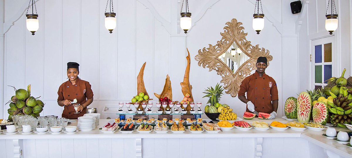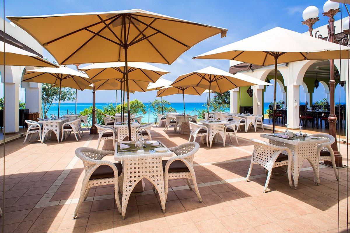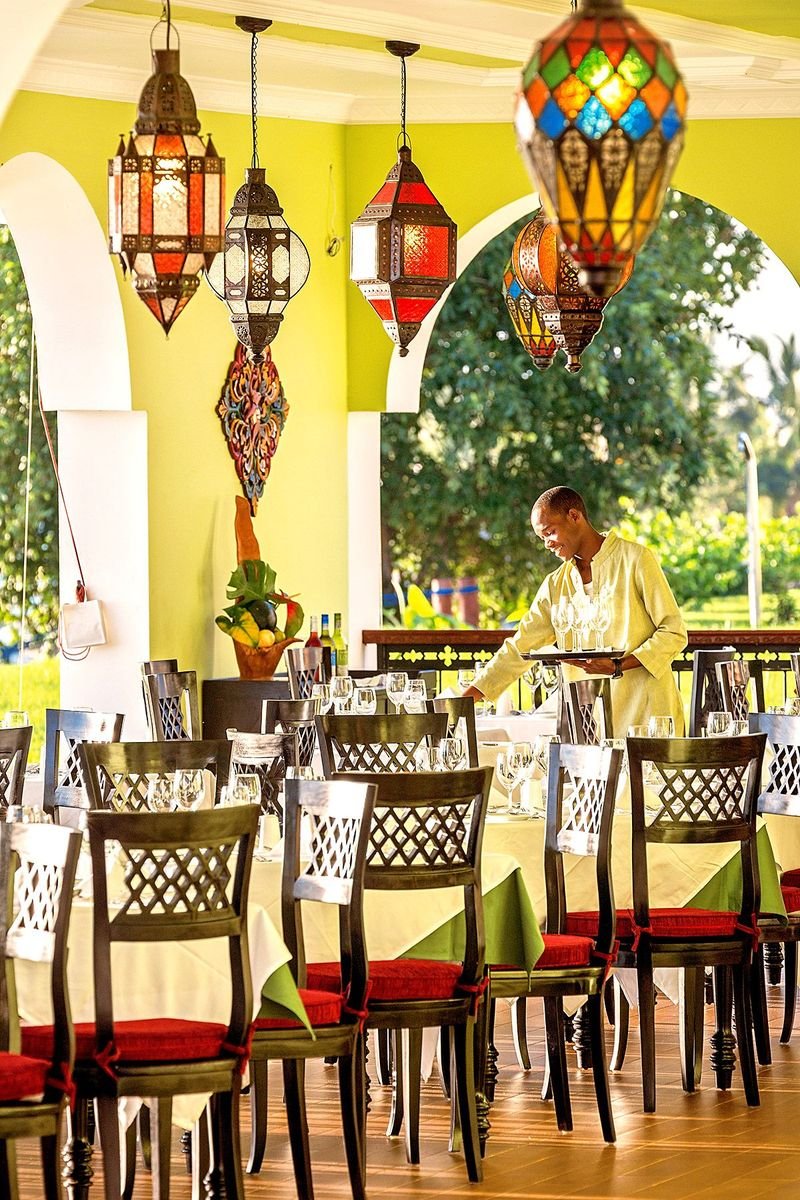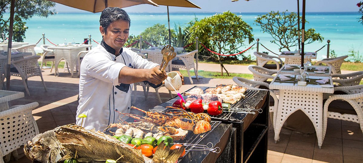 śniadanie (7.30-10.30), obiad (12.30-15.00), kolacja (19.00-22.00) w formie bufetu lub wybór z 3 dań z karty menu w restauracji Aqua; przekąski w barach Sunset i Makuti (11.00-12.00, 16.00-17.00); napoje bezalkoholowe i lokalne napoje alkoholowe w wyznaczonych barach (8.00-24.00); wymagane noszenie opasek all inclusive.