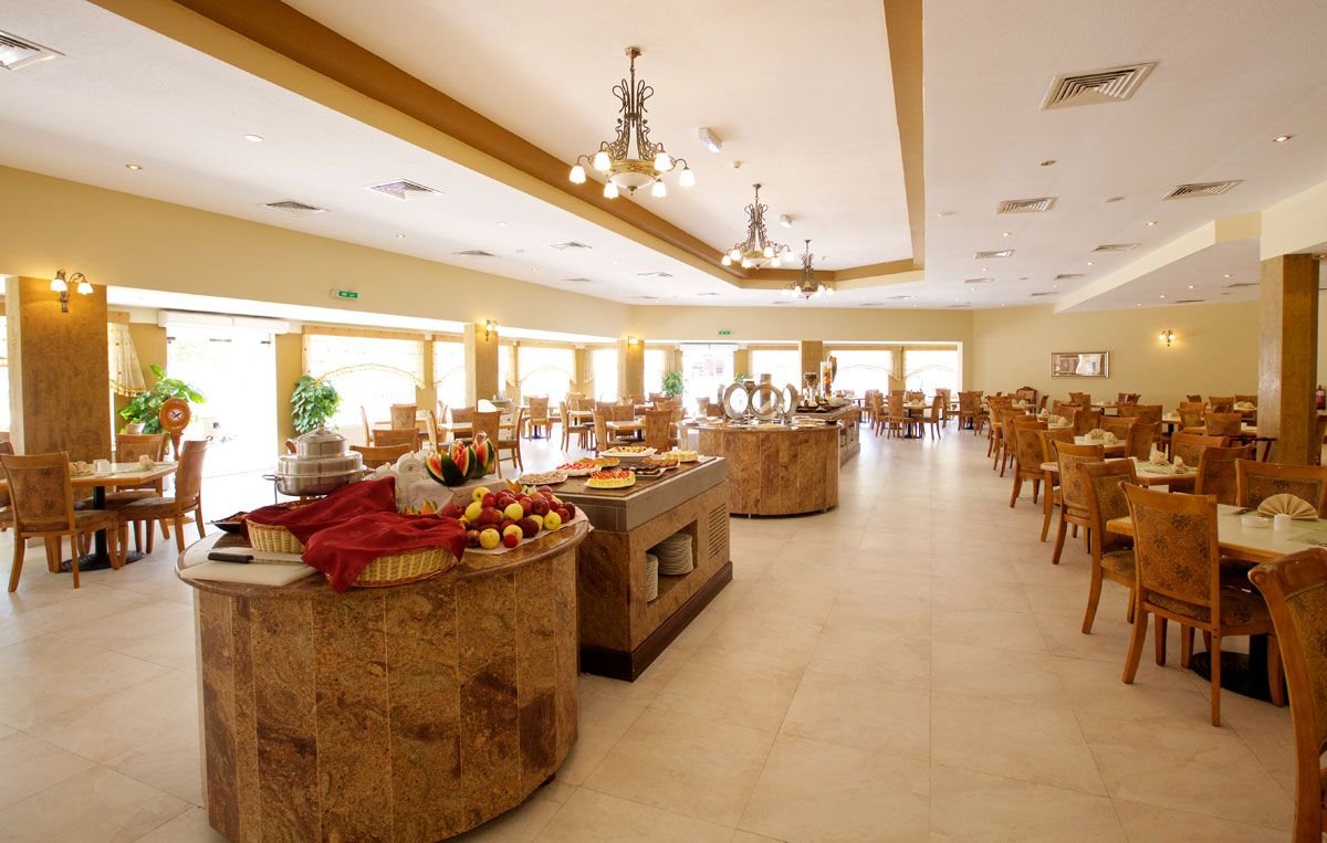 śniadanie (6.30-10.30), obiad (13.00-15.00) w formie bufetu w restauracji Oasis, kolacja (19.00-23.00) w formie bufetu lub à la carte w restauracji Oasis; kawa, herbata, ciastka w barze przy basenie (15.00-17.00); napoje bezalkoholowe i lokalne napoje alkoholowe w wyznaczonych barach (11.00-22.00); wymagane noszenie opasek all inclusive.