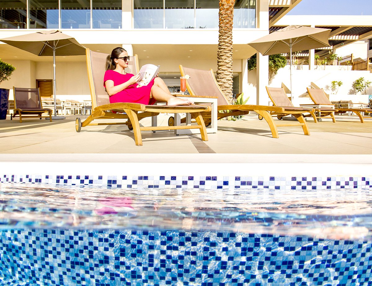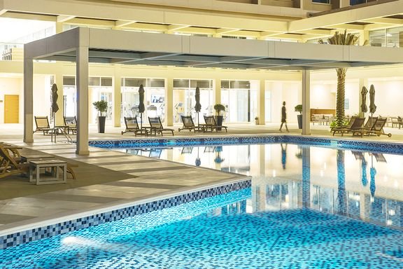 basen, słodka woda, ok. 80 m², wydzielona część dla dzieci, przy basenie bezpłatne parasole, leżaki i materace, 2 korty tenisowe, klub fitness, siłownia.