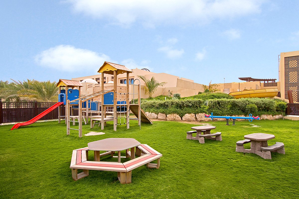 śniadanie (7.00-11.00), obiad (12.30-15.30), kolacja (18.00-23.00) w formie bufetu w restauracji Maarid lub Al Bahar; napoje bezalkoholowe (7.00-23.00) i lokalne napoje alkoholowe (10.00-23.00) w wyznaczonych barach; zniżka 70 AED w restauracjach à la carte; wymagane noszenie opasek all inclusive.