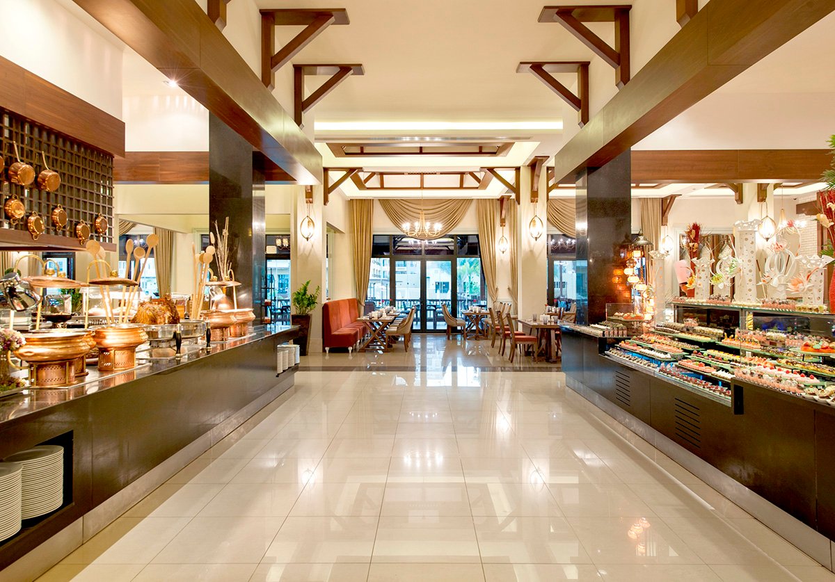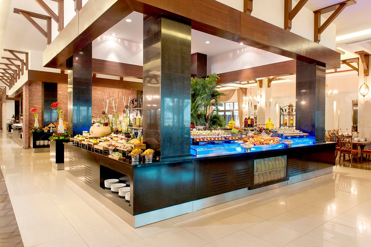 śniadanie (6.30-10.30), obiad (12.30-15.00), kolacja (18.30-22.30) w formie bufetu w restauracji Seven Heights; raz na pobyt kolacja w jednej z restauracji à la carte (wymagana wcześniejsza rezerwacja i odpowiedni strój); przekąski (9.00-19.00), nocne przekąski w wyznaczonym miejscu i czasie; napoje bezalkoholowe oraz wybrane alkohole importowane w wyznaczonych barach i restauracjach (6.30-3.00); wymagane noszenie opasek all inclusive.