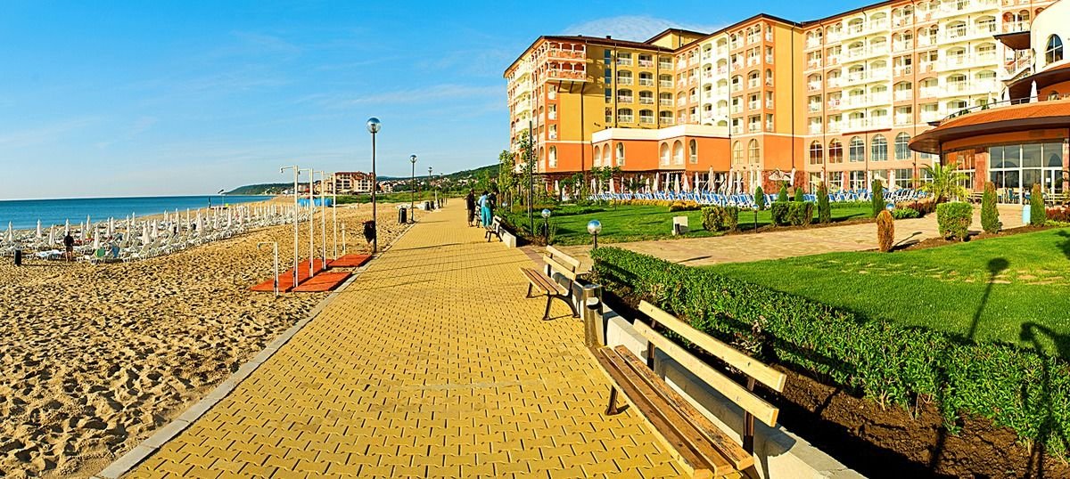 Położony bezpośrednio przy pięknej, piaszczystej plaży z krystalicznie czystym morzem, zaprasza na spacery wzdłuż malowniczego wybrzeża i do uprawiania sportów wodnych. Do dyspozycji Gości przestronne, komfortowo urządzone pokoje, basen i 3 restauracje serwujące dania kuchni bułgarskiej, włoskiej i międzynarodowej. Hotel jest wyjątkowym miejscem na urlop, zwłaszcza dla rodzin z dziećmi oraz amatorów wodnych szaleństw, którzy będą się świetnie bawić w hotelowym parku wodnym.