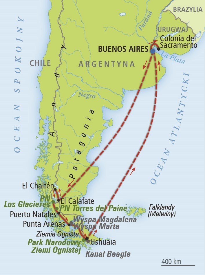 Od gwarnych ulic Buenos Aires, po niezmąconą ciszę lodowców i spektakularne, górskie szlaki Patagonii – to wyprawa przez jedne z najbardziej niezwykłych krajobrazów Ameryki Południowej! W programie podróż przez trzy kraje: Argentynę, Chile i Urugwaj, zachwycające całodniowe trekkingi pod majestatycznym Fitz Royem i Cerro Torre, rejs wśród lodowych gór jeziora Grey, a także spotkanie z pingwinami i lwami morskimi u wybrzeży Ziemi Ognistej. Każdy dzień tej wyjątkowej przygody jest obietnicą ekscytujących wrażeń, pozytywnych emocji, bliskiego kontaktu z naturą i wspomnień, które zostaną w pamięci na długie lata.