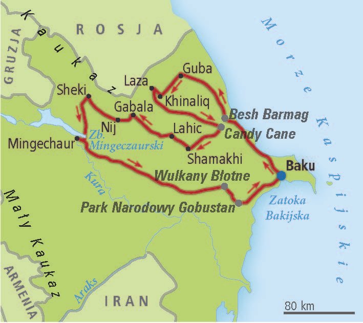 Przylot do BAKU, transfer do hotelu, zakwaterowanie. Czas na odpoczynek. Śniadanie i krótki spacer po centrum, czas wolny na starym mieście. Wykwaterowanie, następnie odbiór samochodów, szkolenie z obsługi pojazdów 4x4 i wyjazd w kierunku góry BESH BARMAG (382 m n.p.m.) krótka wędrówka na górę, z której roztacza się panoramiczny widok na Morze Kaspijskie. Przejazd do GUBY, zakwaterowanie w hotelu, kolacja w lokalnej restauracji, nocleg.