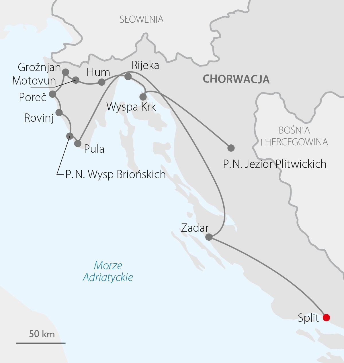 Przygotuj się na niezwykłą podróż po jednym z najpiękniejszych zakątków Europy! Istria to idealna propozycja dla miłośników Toskanii i Prowansji – przepiękne widoki, zachwycająca architektura, zabytki wpisane na listę UNESCO, ciepłe morze i wspaniała kuchnia, z której słynie ten region to tylko część niespodzianek, jakie tu na Ciebie czekają. Na trasie takie perełki, jak Split, Rijeka, Wyspa Krk i Park Narodowy Jezior Plitwickich, a dla łasuchów degustacje win, miodów, prštu oraz trufli! Urozmaicony program, przelot do Splitu i krótkie trasy przejazdu to coś, czego nie ma nikt inny! Trasa w Chorwacji: ok. 760 km.