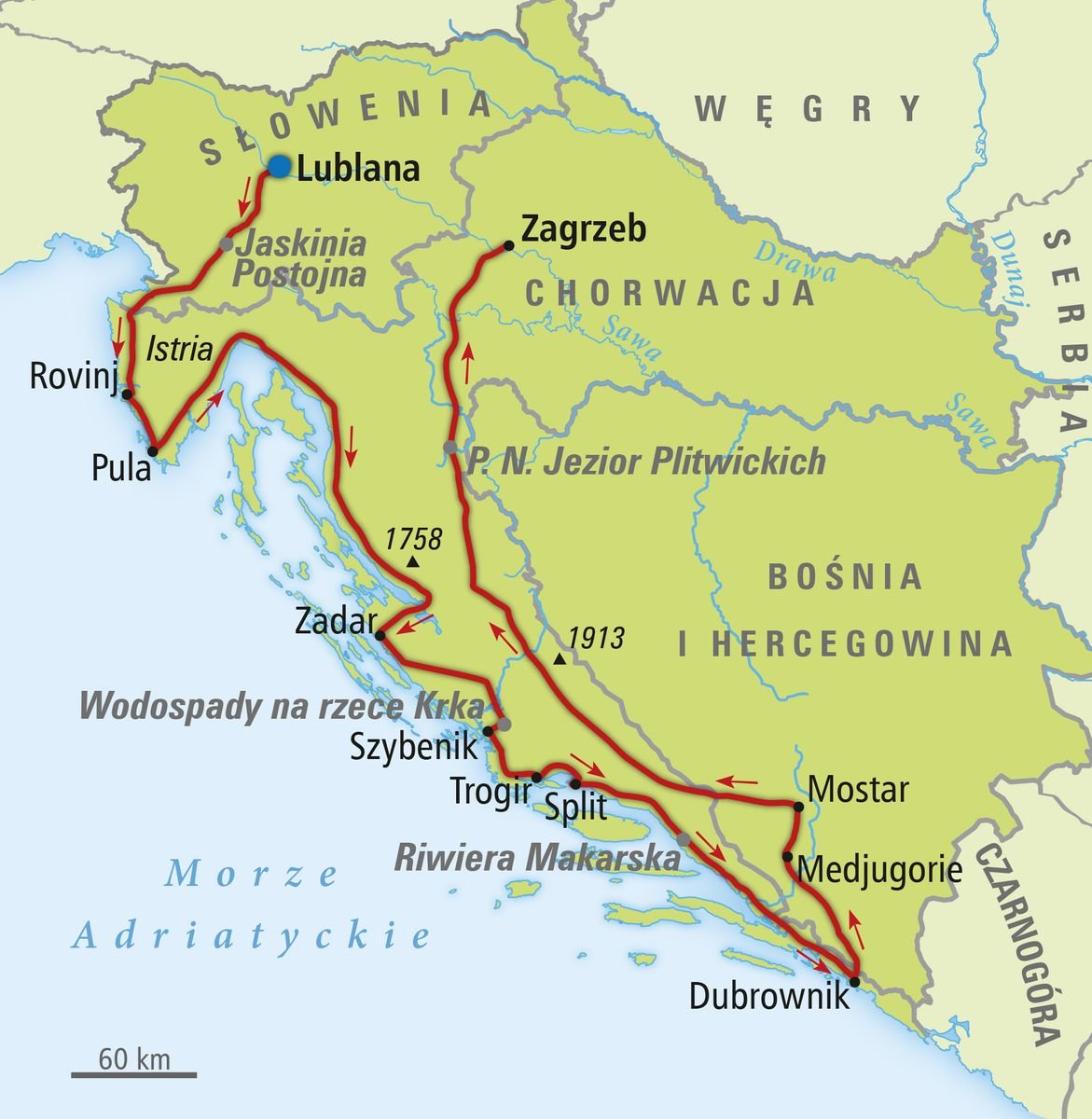 Wspaniałe zabytki Dalmacji i Istrii, malownicze wybrzeże z tysiącem wysp i słynną Riwierą Makarską, znakomity śródziemnomorski klimat sprawiły, że Chorwacja jest od lat popularnym celem wycieczek. „Jeśli chcecie zobaczyć raj na ziemi, przyjedźcie tu” – tak pisał G.B. Shaw o Dubrowniku. W poszukiwaniu miejsc, gdzie dojrzewa śliwowica, podziwiać można nie tylko światowej klasy zabytki, ale także cuda natury, jak słynna jaskinia w słoweńskiej Postojnej, wodospady na rzece Krka i Jeziora Plitwickie. Warto wybrać się na wycieczkę fakultatywną do republiki Bośni i Hercegowiny: Medjugorje to znany ośrodek pielgrzymkowy, miejsce objawień, w Mostarze zachwyca biały kamienny most odbudowany w 2004 r. z zachowaniem metod i surowców sprzed 450 lat! Łączna trasa w krajach zwiedzanych: ok. 3050 km.