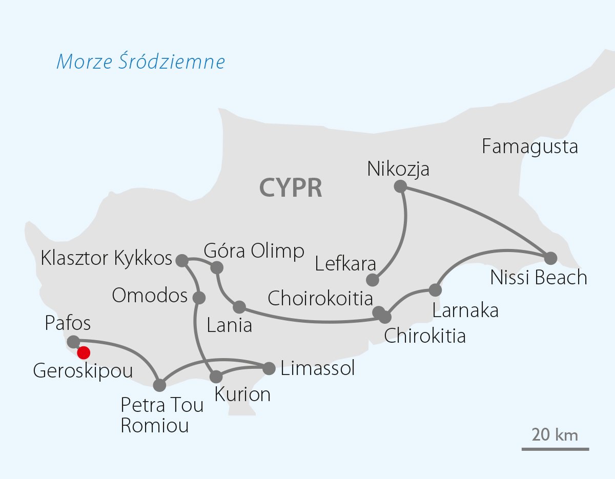 Geroskipou • Pafos • Petra Tou Romiou • Limassol • Kurion • Omodos • Klasztor Kykkos • Góra Olimp • Lania • Chirokitia • Słone Jezioro • Larnaka • Plaża Landa • Nikozja • Lefkara • Choirokoitia