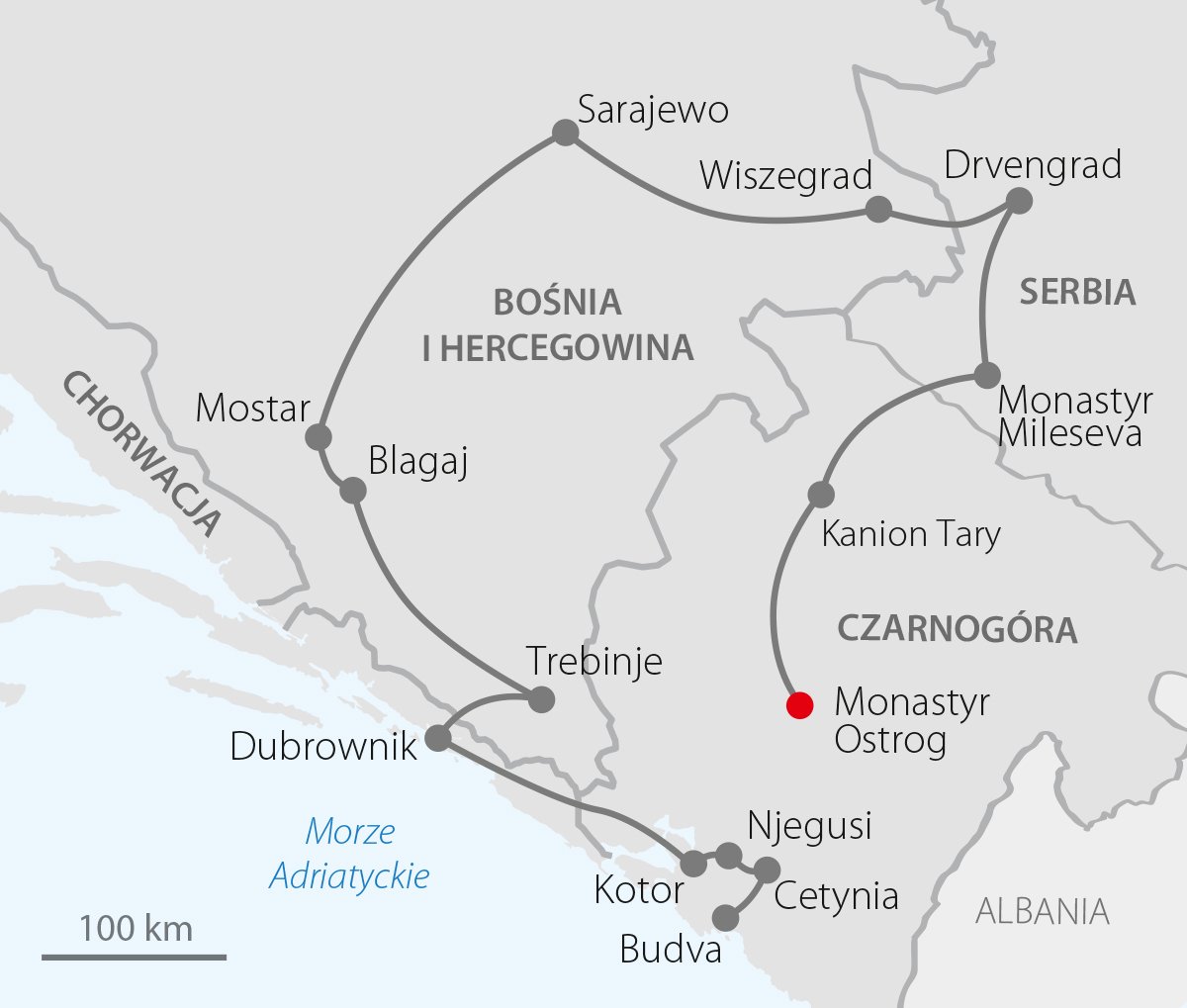 Monastyr Ostrog • Kanion Tary • Drvengrad • Wiszegrad • Sarajewo • Mostar • Blagaj • Trebinje • Dubrownik • Kotor • Njegusi • Cetynia • Budva