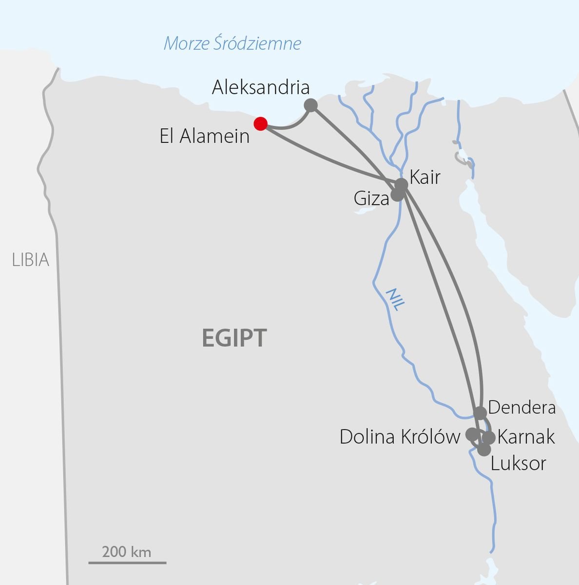 Śniadanie. Wykwaterowanie. Transfer na lotnisko i przelot do KAIRU. Przejazd do EL ALAMEIN – miasta portowego, gdzie podczas II wojny światowej rozegrały się dwie wielkie bitwy. Przejazd do hotelu. Zakwaterowanie. Czas wolny na plażowanie lub samodzielne odkrywanie miasta. Kolacja. Nocleg.
