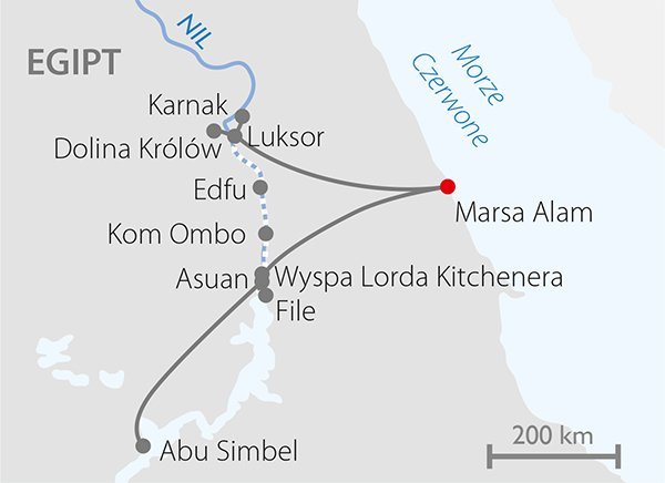 Wspaniała wyprawa do świata egipskich bogów, która wiedzie przez miejsca, gdzie czekają najcenniejsze skarby faraonów: monumentalne zabytki minionych czasów. Rejs od Asuanu do Luksoru wygodnym statkiem wycieczkowym – pływającym hotelem. Tak po Egipcie kiedyś podróżowali faraonowie, a teraz jest to znakomity sposób na zwiedzanie. Na trasie rejsu fascynujący Asuan, Edfu, Dolina Królów, gdzie odkryto grobowiec Tutenchamona, słynne świątynie Luksoru, Karnaku, Kom Ombo, Edfu. Do tego dwa dni wypoczynku w kurorcie Marsa Alam. Warto przedłużyć pobyt w Egipcie o dodatkowy tydzień w hotelu w Marsa Alam z oferty ITAKI. Trasa w Egipcie: ok. 1060 km.