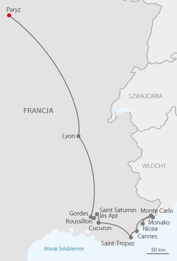 Piękna Francja od zawsze inspiruje artystów, a jej zabytki, kultowe miejsca i niezwykła atmosfera, sprawiły, że „zagrała” w tysiącach filmów. Bohaterem wielu z nich jest Paryż, którego rozpoznawalne budowle, słynne kawiarnie i klimatyczne zakątki stały się naturalnym tłem słynnych produkcji filmowych. Na trasie same filmowe gwiazdy: Lyon – miejsce powstania pierwszych ruchomych obrazów, romantyczna Prowansja, komediowe Saint-Tropez, światowe Cannes i książece Monte Carlo.