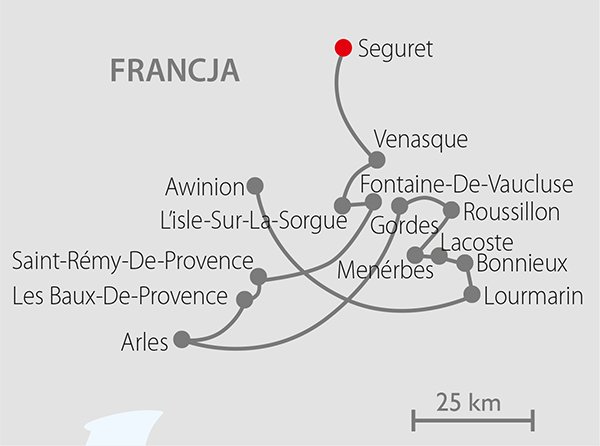 Śniadanie. Wyjazd do SEGURET, wpisanego na oficjalną listę najpiękniejszych miasteczek we Francji. Spacer wąskimi, brukowanymi uliczkami, odkrywający niezwykły urok i długą historię tego miejsca. Na uwagę zasługują tutejsze wina Côtes du Rhône Séguret. Przejazd do maleńkiego VENASQUE wzniesionego na szczycie stromej skały, dominującego na doliną Nesque. Miejscowość jest jedną z najstarszych w regionie, surowy urok dodaje jej autentyczności. Warsztaty artystów, maleńkie kawiarnie i tajemnicze wielowiekowe drzwi nadają mu niezapomniany klimat. Spacer po miasteczku i zwiedzanie baptysterium, jednego z najstarszych obiektów sakralnych we Francji. Wyjazd do poprzecinanego licznymi kanałami L’ISLE-SUR-LA-SORGUE. Krótka przechadzka po miasteczku opisanym w książce „Hotel Pastis” Petera Mayle’a. Zwiedzanie kościoła Notre-Dame-des-Anges. Przejazd do FONTAINE-DE-VAUCLUSE, gdzie zobaczyć można jeden z cudów Prowansji – źródło rzeki Sorgue, zimą i wiosną wytryskujące z ogromną siłą z głębokiej rozpadliny nad miastem i od razu stające się rzeką. Spacer wzdłuż rzeki drogą zacienioną platanami, wizyta w młynie produkującym papier czerpany. Czas wolny. Powrót do hotelu, nocleg.