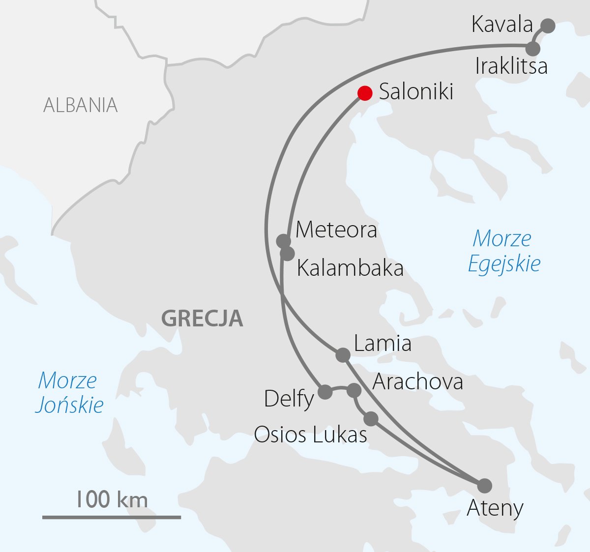 Saloniki • Kalambaka • Meteora • Delfy • Arachova • Osios Lukas • Ateny • Lamia • Iraklitsa • Kavala