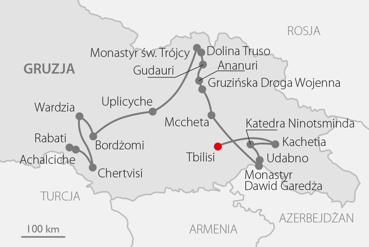 Gruzja to kraj, który spełni marzenie każdego miłośnika podróży. Niezwykłe krajobrazy, potęga przyrody, wspaniałe zabytki to nie wszystko. Gruzja to także gościnni mieszkańcy, wspaniała tradycja wspólnego biesiadowania, pyszne wina i oryginalne potrawy. Codzienność przeplata się tu z bogatą historią, której świadectwa przetrwały do dzisiaj. Każdy region Gruzji ma swoją specyfikę, którą warto poznać. Na trasie są tajemnicze monastyry, potężne twierdze, wspaniałe widoki, Kazbeg - mityczna góra Prometeusza. Będzie także wiele okazji do degustacji gruzińskich przysmaków i spotkań z mieszkańcami Gruzji. Trasa w Gruzji: ok. 1600 km.