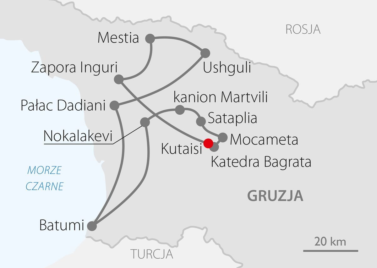 Śniadanie. Wykwaterowanie. Przejazd do ruin NOKALAKEVI, nadrzecznej twierdzy nad rzeką Techuri, pochodzącej z czasów bizantyjskich z dobrze odtworzonymi murami miejskimi. Następnie zwiedzanie KANIONU MARTVILI, gdzie wysokie skały porośnięte bujną roślinnością malowniczo komponują się z intensywnym kolorem wody. Przejazd do hotelu, zakwaterowanie, kolacja, nocleg.