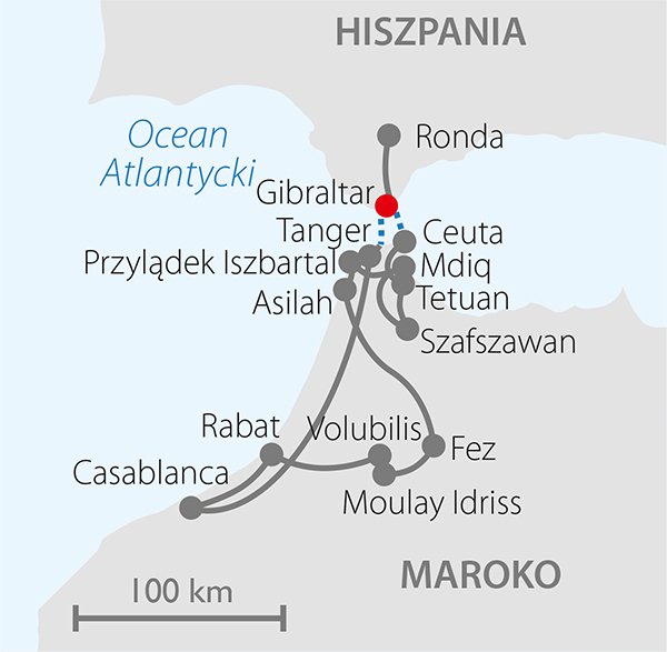 Śniadanie. Wykwaterowanie. Przejazd do GIBRALTARU, brytyjskiego terytorium zamorskiego na Półwyspie Iberyjskim, półwyspu o długości zaledwie 6 km. Fakultatywnie (za dodatkową opłatą na miejscu): przejazd do punktu widokowego Punta de Europa, skąd rozciąga się wspaniały widok na Cieśninę Gibraltarską i góry Atlas na kontynencie afrykańskim, gdzie znajduje się pomnik upamiętniający tragiczną śmierć generała Władysława Sikorskiego, przejazd przez rezerwat przyrody z 600 gatunkami flory do Groty św. Michała, wjazd na Skałę Gibraltarską, gdzie można zobaczyć małpki bezogonowe, które według legendy są gwarancją angielskiego panowania nad skałą. Czas wolny na zakupy (na Gibraltarze obowiązuje strefa wolnocłowa). Przejazd do portu w Algeciras i przeprawa promowa do Ceuty, hiszpańskiego miasta położonego w Afryce. Przejazd do TANGERU, jednego z najstarszych miast królewskiego Maroka, położonego na skrzyżowaniu szlaków Europy i Afryki. Spacer po medynie z labiryntem zakamarków i krętych wąskich uliczek. Przejazd do hotelu, zakwaterowanie, kolacja, nocleg.