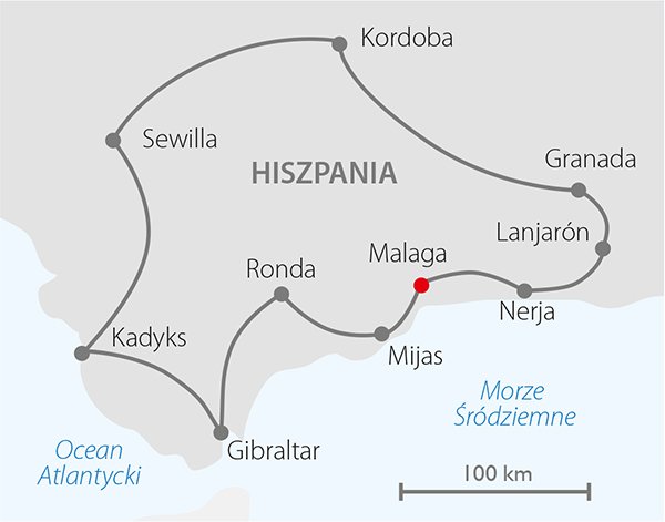 Malaga • Mijas • Ronda • Gibraltar • Kadyks • Sewilla • Kordoba • Granada • Lanjarón • Nerja
