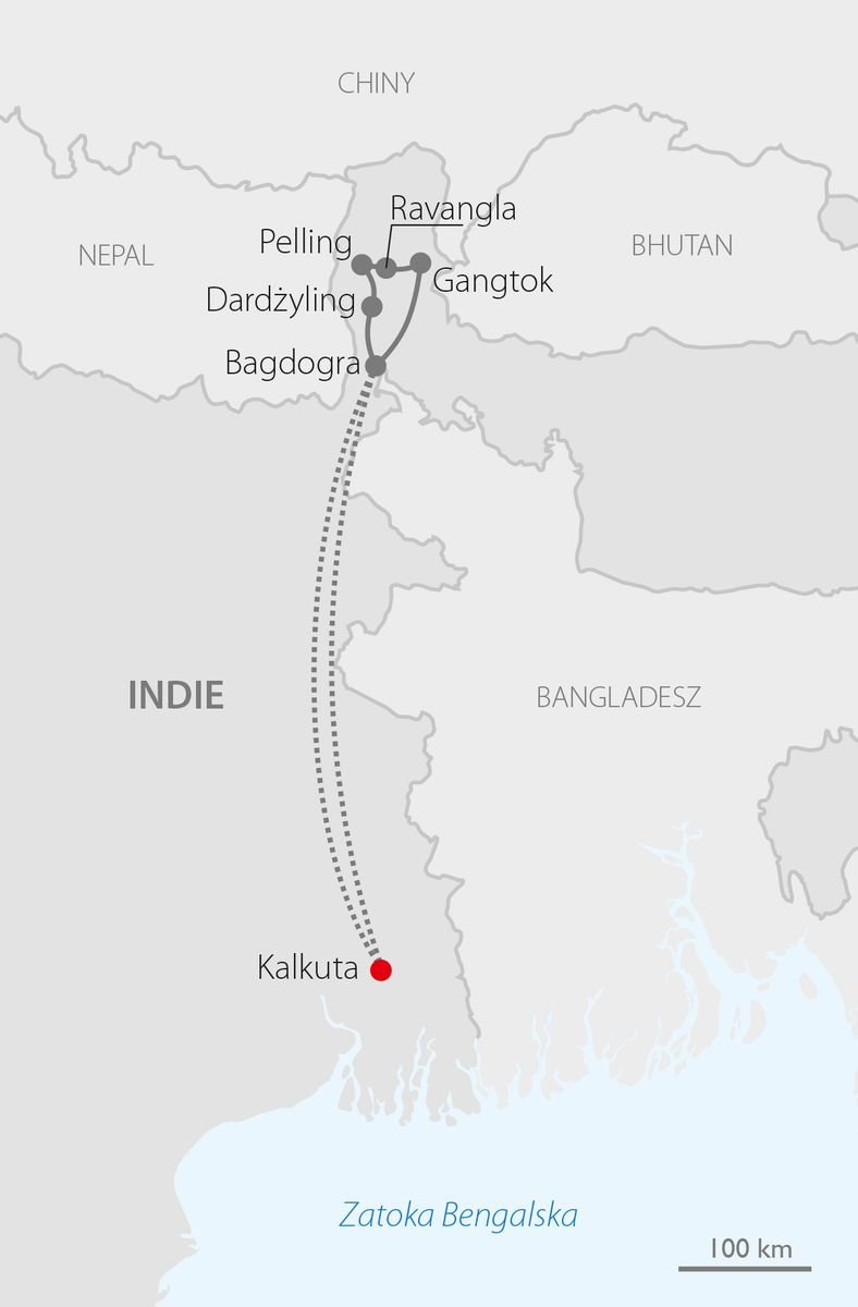 Śniadanie. Wykwaterowanie z hotelu. Transfer na lotnisko. Przelot do BAGDOGRY, miasta w Zachodnim Bengalu. Otoczone wzgórzami porośniętymi krzewami herbacianymi jest bramą komunikacyjną tej części Indii. Następnie przejazd do DARDŻYLING, popularnej górskiej miejscowości z idyllicznym otoczeniem, przyjemnym klimatem oraz wspaniałymi widokami na górskie szczyty, w tym na trzecią najwyższą górę świata, Kanczendzongę. To także kraina buddyjskich klasztorów, bujnych plantacji herbaty i okazałych kolonialnych budynków. Jeśli czas pozwoli, po drodze wizyta w herbaciarni Happy Valley Tea Estate, która jest jedną z najwyżej położonych plantacji herbaty na świecie. Przejazd do hotelu. Zakwaterowanie, kolacja i nocleg.