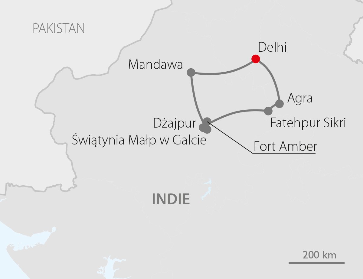 Delhi • Mandawa •  Świątynia Małp w Galcie • Fort Amber • Dżajpur • Fatehpur Sikri • Agra •  Delhi