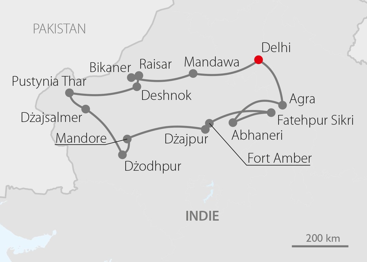 Delhi • Agra • Abhaneri • Fatehpur Sikri • Fort Amber • Dżajpur • Mandore • Dżodhpur • Dżajsalmer  • Pustynia Thar • Deshnok • Raisar • Bikaner • Mandawa • Delhi