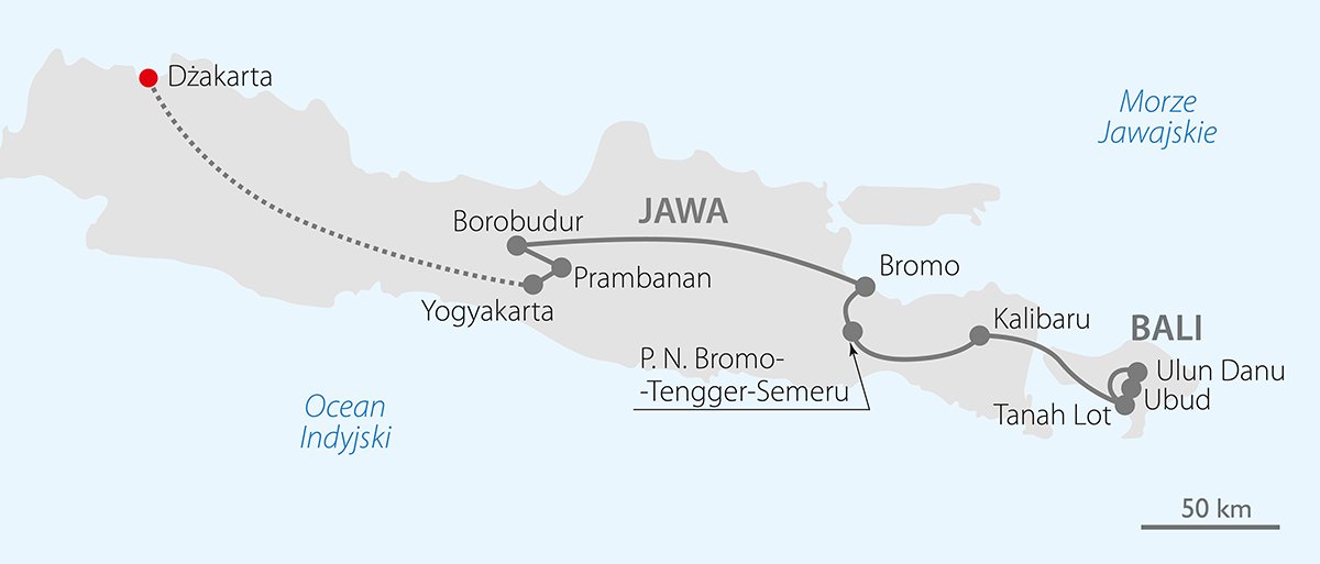 Tanah Air Kita, czyli nasza ziemia i nasza woda to określenie Indonezji, używane przez mieszkańców tego wyspiarskiego kraju. Trasa pełna przygód prowadzi przez Jawę, serce Indonezji, która oszałamia kontrastami, oraz przez uwodzicielską i magiczną Bali kuszącą wspaniałymi krajobrazami i plażami. Obie wyspy fascynują kulturą i tradycyjnymi obrzędami. Ludzie, pejzaże, potrawy – wszystko jest tu barwne i egzotyczne. W znakomicie zaplanowanym programie jest czas na wszystko: wizyty w starożytnych świątyniach, podziwianie nieziemskich krajobrazów dżungli i wulkanów, wizyta na plantacji wanilii i cynamonu oraz zabytki z listy UNESCO. Przewidziano nawet krótki wypoczynek na rajskich plażach Bali.