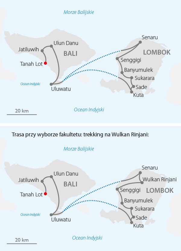 Magiczna podróż po egzotycznym archipelagu Małych Wysp Sundajskich prowadzi przez indonezyjskie wyspy: Bali oraz Lombok – ich najważniejsze zabytki, ciekawe miejsca pełne kontrastów i fantastycznych krajobrazów. Bali to wyspa obrzędów i rytuałów, która słynie z soczyście zielonych pól ryżowych sięgających aż do błękitnego nieba i oszałamia kolorami podczas spacerów wśród barwnych targów z tropikalnymi owocami. Górzysta wyspa Lombok uwodzi pięknymi krajobrazami wśród wodospadów i pieszych szlaków. Dla chętnych trasa wycieczki wiedzie także na Archipelag Gili i wyspę Nusa Penida, raju dla miłośników pięknych plaż lub na majestatyczny wulkan Rinjani.