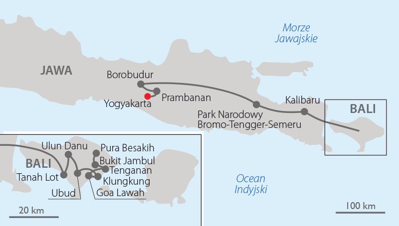 Zapraszamy na wyjazdy z cyklu egzotycznych podróży Wakacje pod palmami, łączące zwiedzanie i wypoczynek w najodleglejszych zakątkach świata. Pełna przygód trasa prowadzi przez Jawę, serce Indonezji, oszałamiającą kontrastami i uwodzicielską, magiczną Bali kuszącą wspaniałymi krajobrazami i plażami. Obie wyspy fascynują kulturą i tradycyjnymi obrzędami. Ludzie, pejzaże, potrawy – wszystko jest tu barwne i egzotyczne. W znakomicie zaplanowanym programie jest czas na wszystko: wizyty w starożytnych świątyniach, podziwianie nieziemskich krajobrazów dżungli i wulkanów, wizytę na plantacji wanilii i cynamonu oraz zabytki z listy UNESCO. Na zakończenie zapraszamy na wypoczynek na rajskich plażach Bali.