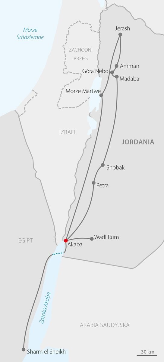 Śniadanie. Wykwaterowanie. Przejazd do stolicy Jordanii – AMMANU. Panoramiczne zwiedzanie miasta. Przejazd do JERASH, nazywanego Pompejami Azji, zwiedzanie jednego z najlepiej zachowanych i najbardziej oryginalnych miast rzymskich na Bliskim Wschodzie. Przejazd nad MORZE MARTWE, które leży w najgłębszej depresji świata, sięgającej ok. 400 m. Okazja do skorzystania z jedynej w swoim rodzaju kąpieli – ze względu na ogromne zasolenie (ok. 26%) i dużą gęstość wody, morze wypycha pływającego na powierzchnię. Przejazd do Akaby. Zakwaterowanie w hotelu, kolacja, nocleg.