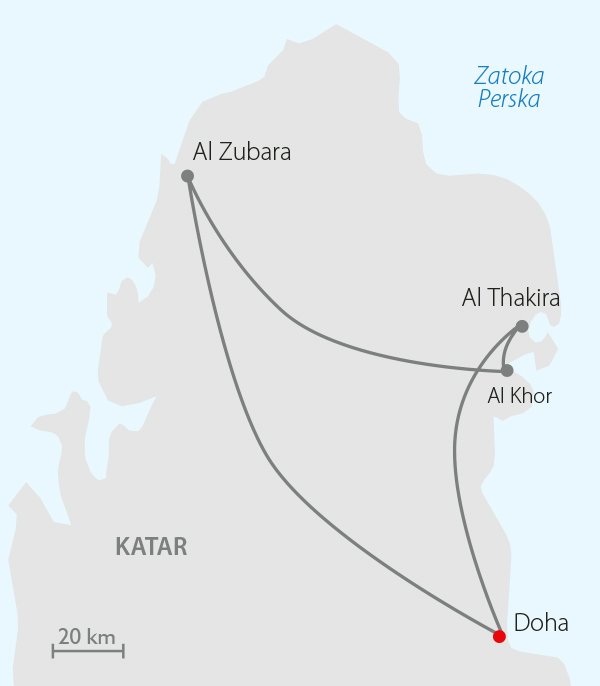 Doha • Fort Al Zubara • Al Khor • Al Thakira • Wioska Kultury • Al Wakra • Souq Waqif • Muzeum Narodowe Kataru • Muzeum Iluzji • Inland Sea