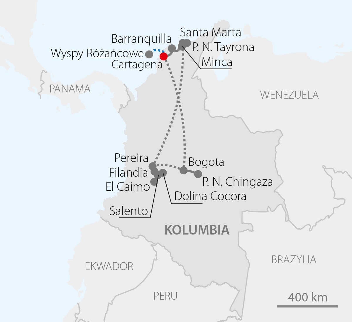 Poznaj najbardziej fascynujące oblicza kraju tysiąca smaków, kolorów i rytmów. Od zachwycającej kolonialną architekturą, otoczonej zabytkowymi murami Cartageny, przez Bogotę, tętniącą życiem stolicę kraju, gdzie barwna przeszłość spotyka się z nowoczesnym duchem metropolii, aż po P.N. Chingaza, który jest domem dla rzadkich gatunków zwierząt, czy P.N. Tayrona na granicy plaży, tropikalnej dżungli i kordyliery Sierra Nevada de Santa Marta. Odwiedź najstarsze miasto Kolumbii i poznaj proces powstawania aromatycznej kawy wśród zielonych wzgórz regionu kawowego, na plantacji Café La Morelia. Dla koneserów pięknych widoków polecamy dodatkowo rejs na egzotyczne i koralowe Islas de Rosario, czyli Wyspy Różańcowe. Na zakończenie odpocznij w hotelu Irotama del Lago lub na białych plażach w okolicy Santa Marta, gdzie zrelaksujesz się w tropikalnej scenerii, przy rytmach salsy i cumbia!
