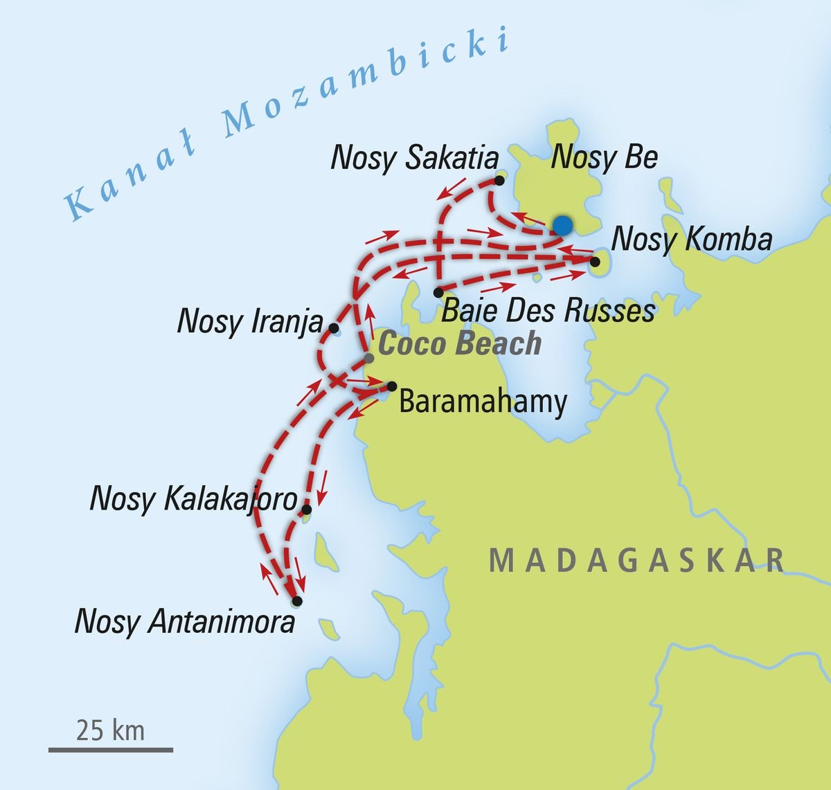 Śniadanie. Rejs na drugą stronę wyspy NOSY KALAKAJORO. Wizyta na plantacji kokosów, możliwość skosztowania świeżych orzechów i ich orzeźwiającego mleczka lub czas wolny na plaży i kąpiel w krystalicznie czystej, turkusowej zatoce. Następnie rejs na NOSY ANTANIMORA, maleńką wysepkę niemal w całości pokrytą palmami kokosowymi. Lunch w trakcie żeglugi. Czas wolny. Możliwość obserwacji życia Malgaszy zajmujących się rybołówstwem i rękodziełem. Kolacja i nocleg na katamaranie (czas rejsu: ok. 4 godz.).