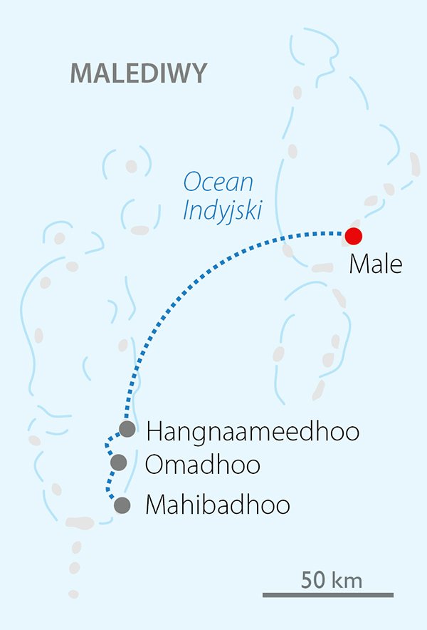 Przylot do MALE, stolicy Malediwów, kraju wyjątkowego w skali całego globu. Malediwy to 26 atoli i blisko 1300 wysepek rozsianych na przestrzeni około 300 km². Ląd stały stanowi jedynie około 1% powierzchni kraju, a najwyższe wzniesienie to zaledwie ok. 5 m n.p.m. Transfer łodzią motorową na HANGNAAMEEDHOO, jedną z wysp Południowego Atolu Ari, położoną ok. 70 km od Male. Zakwaterowanie w hotelu. Czas wolny. Kolacja, nocleg.