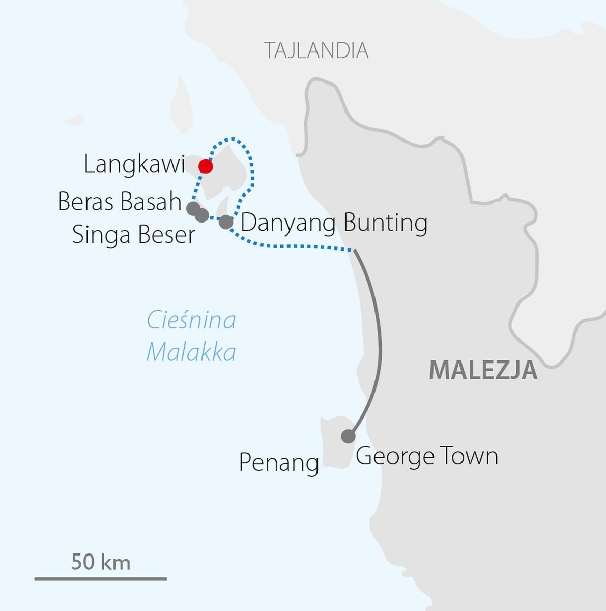 Śniadanie. Czas wolny na plażowanie lub fakultatywnie (za dodatkową opłatą na miejscu): zwiedzanie LANGKAWI. W programie: przystanek przy Eagle Square, na którym znajduje się 12-metrowy pomnik brązowego orła – symbol siły wyspy. Rejs łodzią przez gęsty las namorzynowy Światowego Geoparku UNESCO otoczony wapiennymi jaskiniami i ukrytym kanionem. Po drodze można zobaczyć małpy, zimorodki, jaszczurki monitorujące i kraby błotne. Następnie przystanek przy plaży Tanjung Rhu, jednej z najbardziej malowniczej na wyspie. Wjazd jedną z najbardziej stromych kolei linowych na świecie o długości 920 m na szczyt słynnej góry Mat Cincang, skąd można podziwiać wspaniałe widoki na Morze Andamańskie i okoliczne wysepki. W pogodne dni widać również brzeg Tajlandii i Indonezji. Na odważnych na górze czeka możliwość przejścia Podniebnym Mostem – konstrukcją łączącą dwa okoliczne wzgórza, położoną na wysokości 660 m n.p.m. Powrót do hotelu. Nocleg.