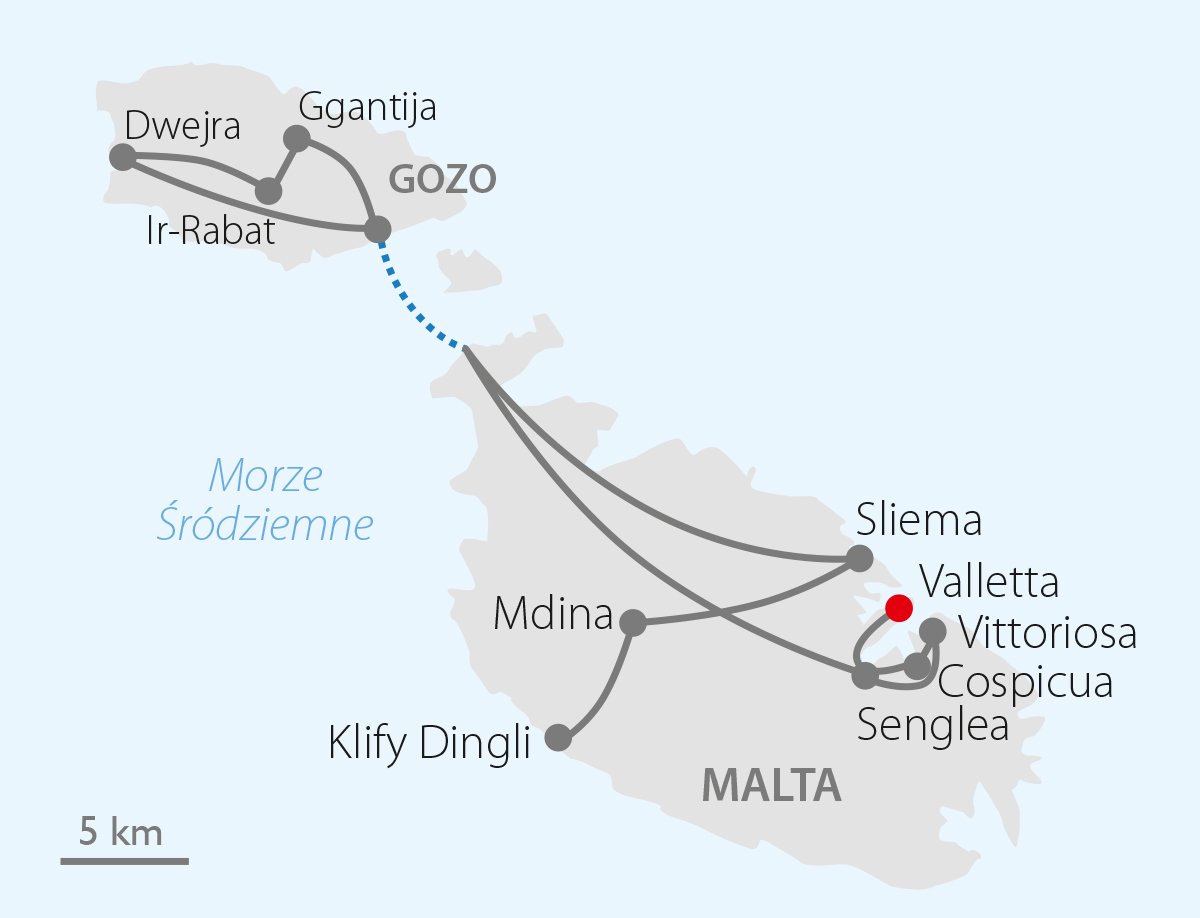 Idealny program dla osób ceniących sobie wypoczynek połączony ze zwiedzaniem w przyjemnym, spokojnym tempie. Podczas wycieczki po najpiękniejszych zakątkach wyspy wszystkie noclegi w jednym hotelu, profesjonalni piloci i prawdziwe „perełki". Poznaj barwną historię Zakonu Maltańskiego, zanurz się w niepowtarzalnym klimacie kolorowych uliczek Valletty, zobacz prehistoryczne budowle i zachwyć się widokami na szczyty majestatycznych Klifów Dingli, na południu wyspy! W programie również fakultatywna wycieczka na wyjątkową wyspę Gozo. Trasa na Malcie: ok. 70 km.