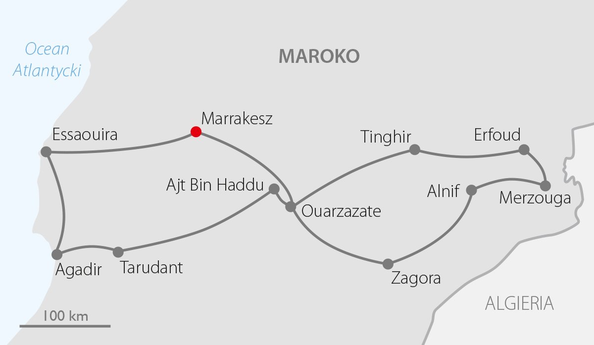 Odkryj południe Maroka – miejsca, gdzie majestatyczne góry spotykają się z bezkresną pustynią, a na horyzoncie falują zielone oazy palm daktylowych. Złocisty zachód słońca oglądany z wydm Sahary to niezapomniane przeżycie, a malownicze wąwozy i tajemnicze kazby wznoszące się na tle błękitnego nieba przypominają scenerię filmową. Trasa wycieczki prowadzi przez Marrakesz z pałacami, meczetami i ogrodem Majorelle, Ouarzazate ze Studiami Filmowymi Atlas oraz Zagorę z gajami palmowymi. W Alnif i Merzouga zobaczysz tradycyjne berberyjskie wioski i imponujące wydmy Erg Chebbi, a przejazd wzdłuż wąwozu Tudra i doliny Dades ukazuje niezwykłe formacje skalne i aromatyczne pola róż. Gotowi na podróż?